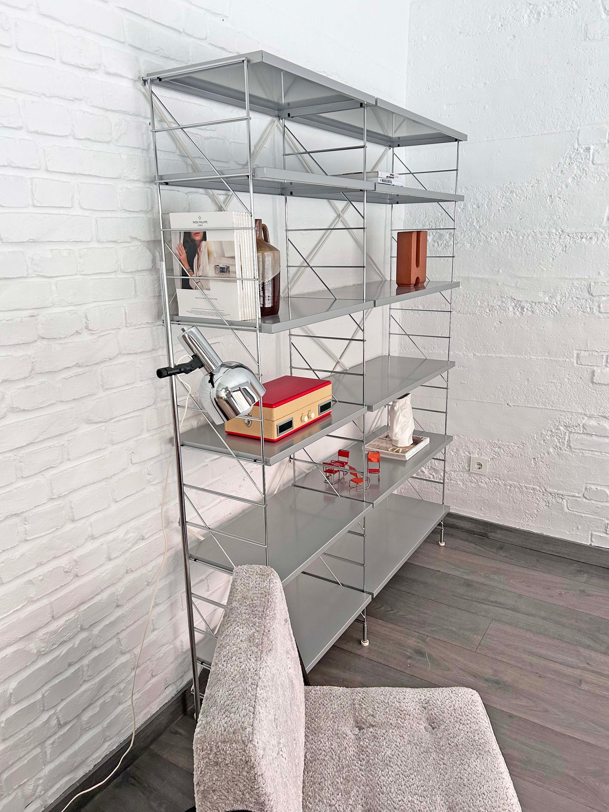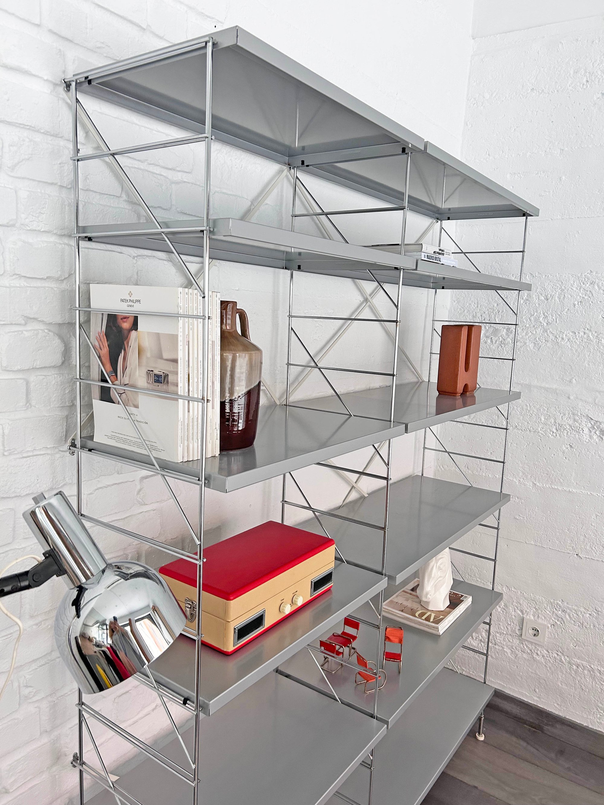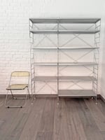 Un clásico del buen diseño español. Sistema de estanterías modulares diseñadas por Massana y Tremoleda en los años 70, y fabricada por la barcelonesa, MOBLES 114. Perfiles cromados y estantes metálicos grises.
