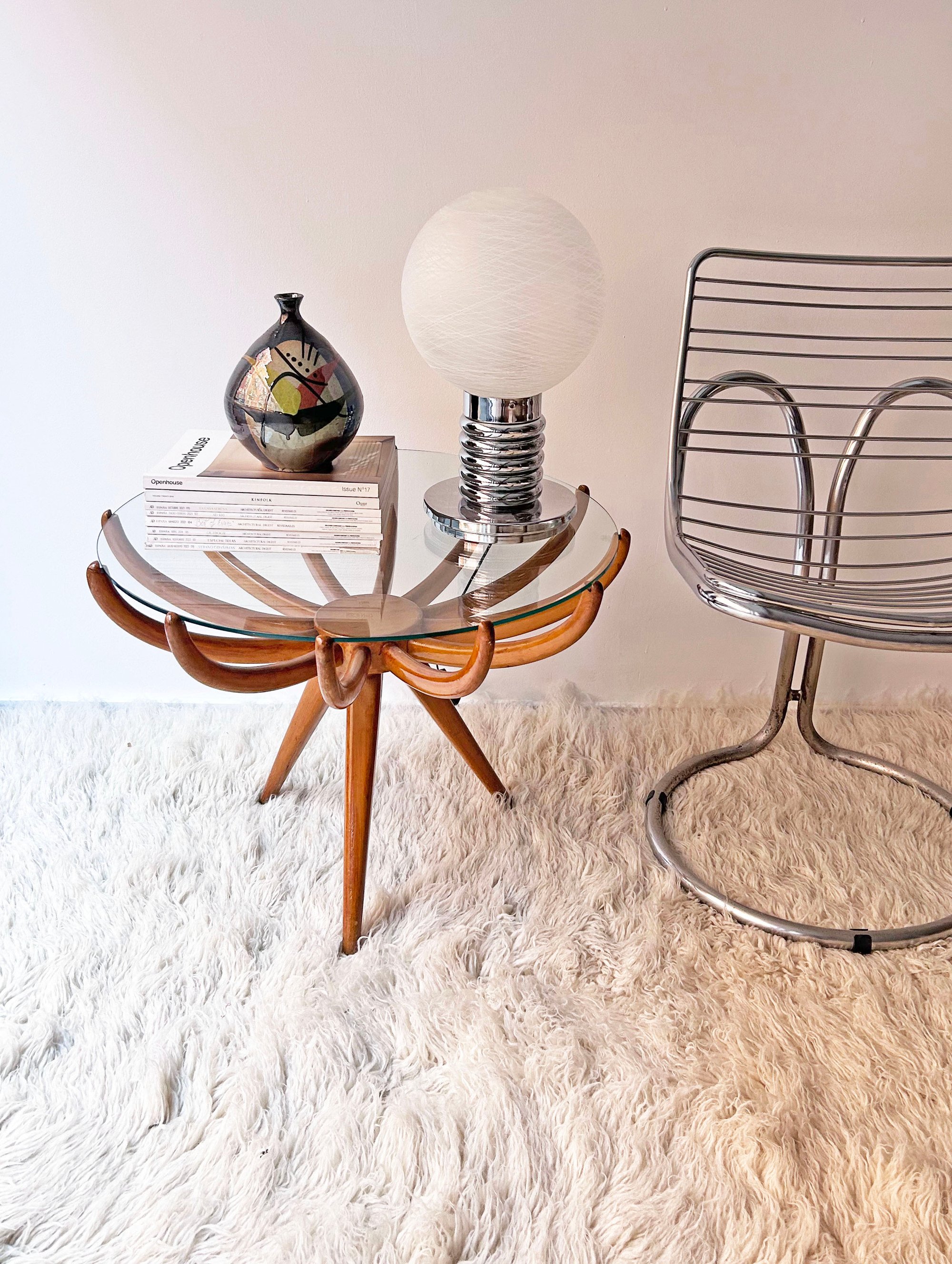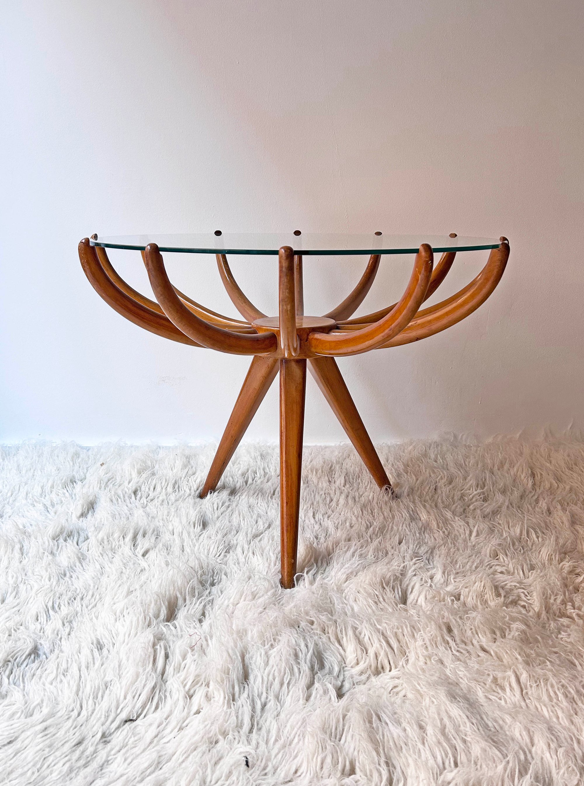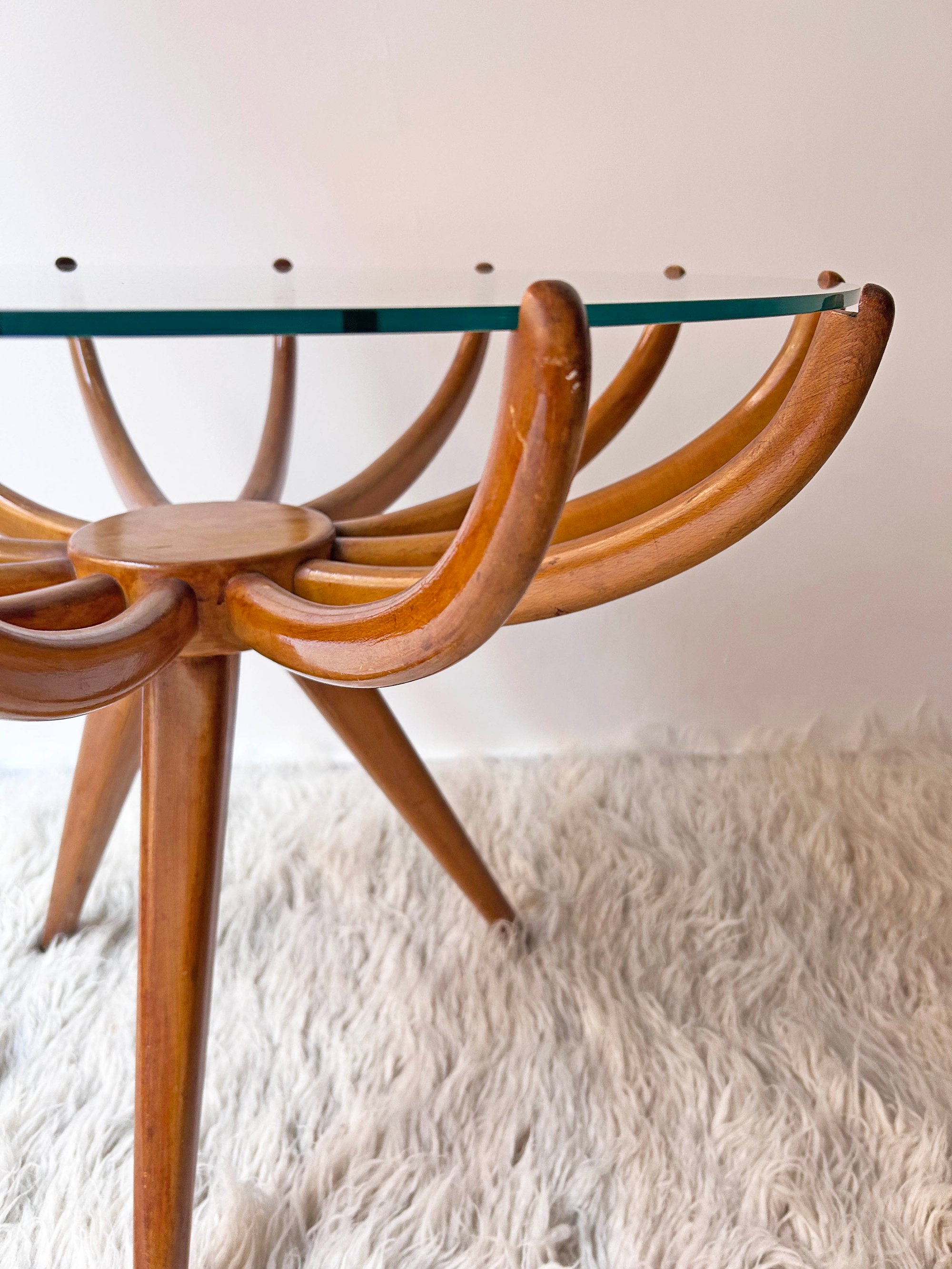 Inevitablemente, recuerda a la mesa auxiliar Ragno que diseñó el arquitecto Carlo de Carli en la década de los 50. Cuerpo de madera con plato central del que salen 12 brazos donde apoya el sobre de vidrio. Guardada en un trastero durante mucho tiempo. Marcas de uso en la madera.