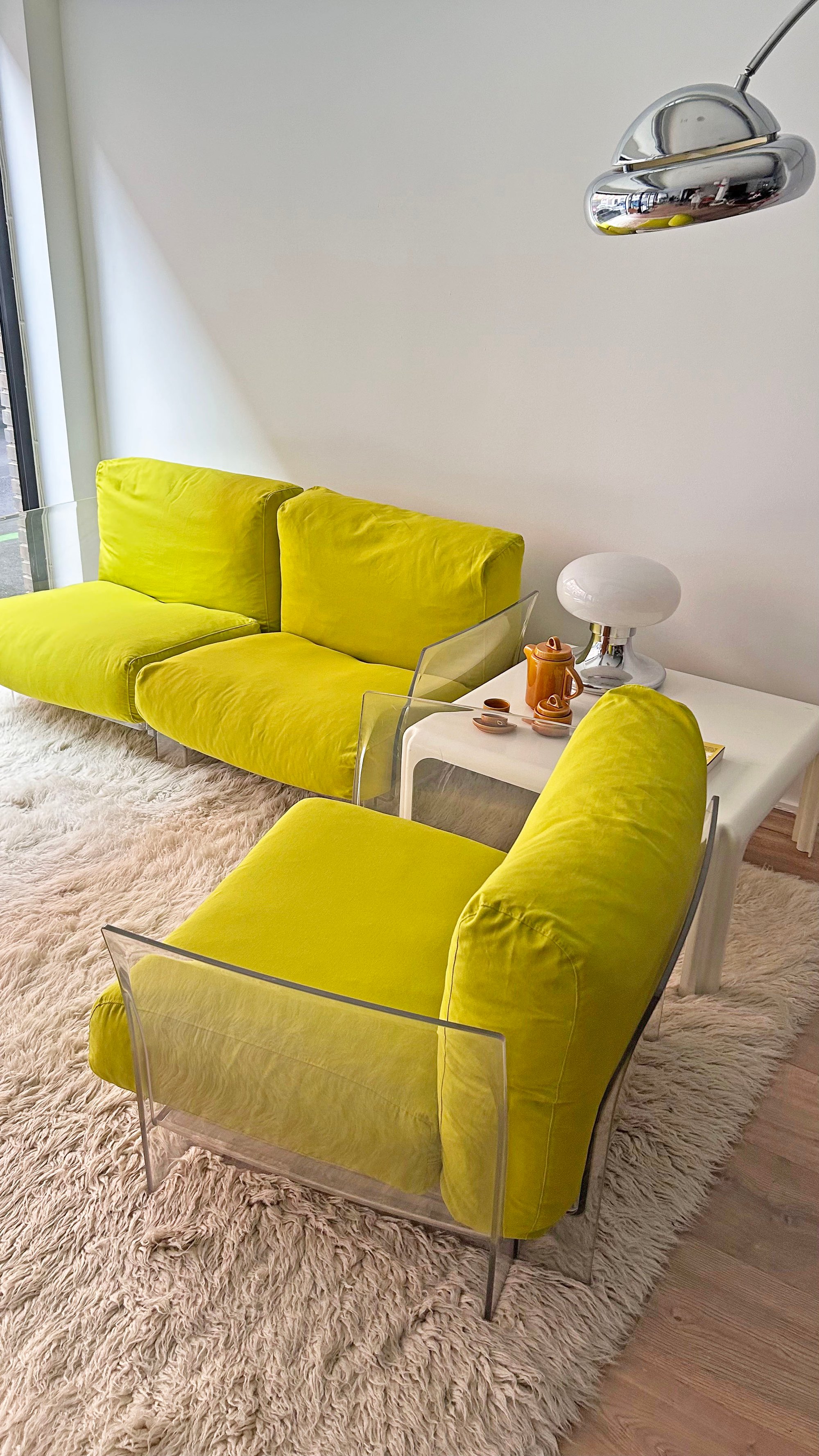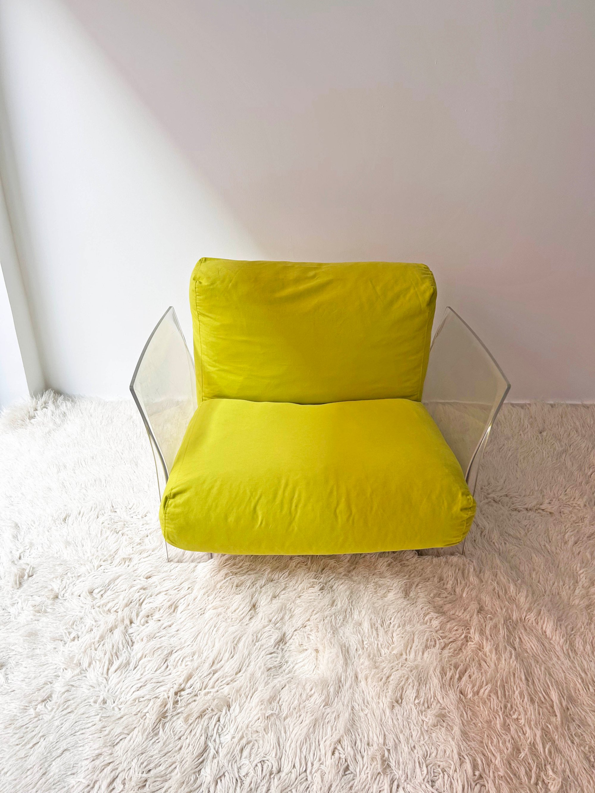 La colección POP de sofás modulares y sillones fueron diseñadas por Piero Lissoni y Carlo Tamborini en el año 2007. En la actualidad se siguen fabricando. Estructura de policarbonato transparente con cojines de pluma. Medidas: 70 cm de alto x 92 cm de ancho x 94 cm de fondo. COLORES: Funda en color LIMA, ROJO y con estampado MISSONI.