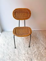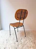Preciosa silla de mimbre con estructura metálica pintada de negro. La mezcla de materiales de caña y ratán es ideal. Tiene un claro estilo Mid-Century con lineas curvas y aspecto ligero. Recuerda mucho a los diseños del holandés R. Noordwolde de los 50 o los de Danny Ho Fong. Faltas en la fibra y retoques de pintura sin cariño. Pieza con mucha personalidad. Disponible también una pareja de sillas con reposabrazos y un taburete de la misma serie.