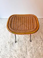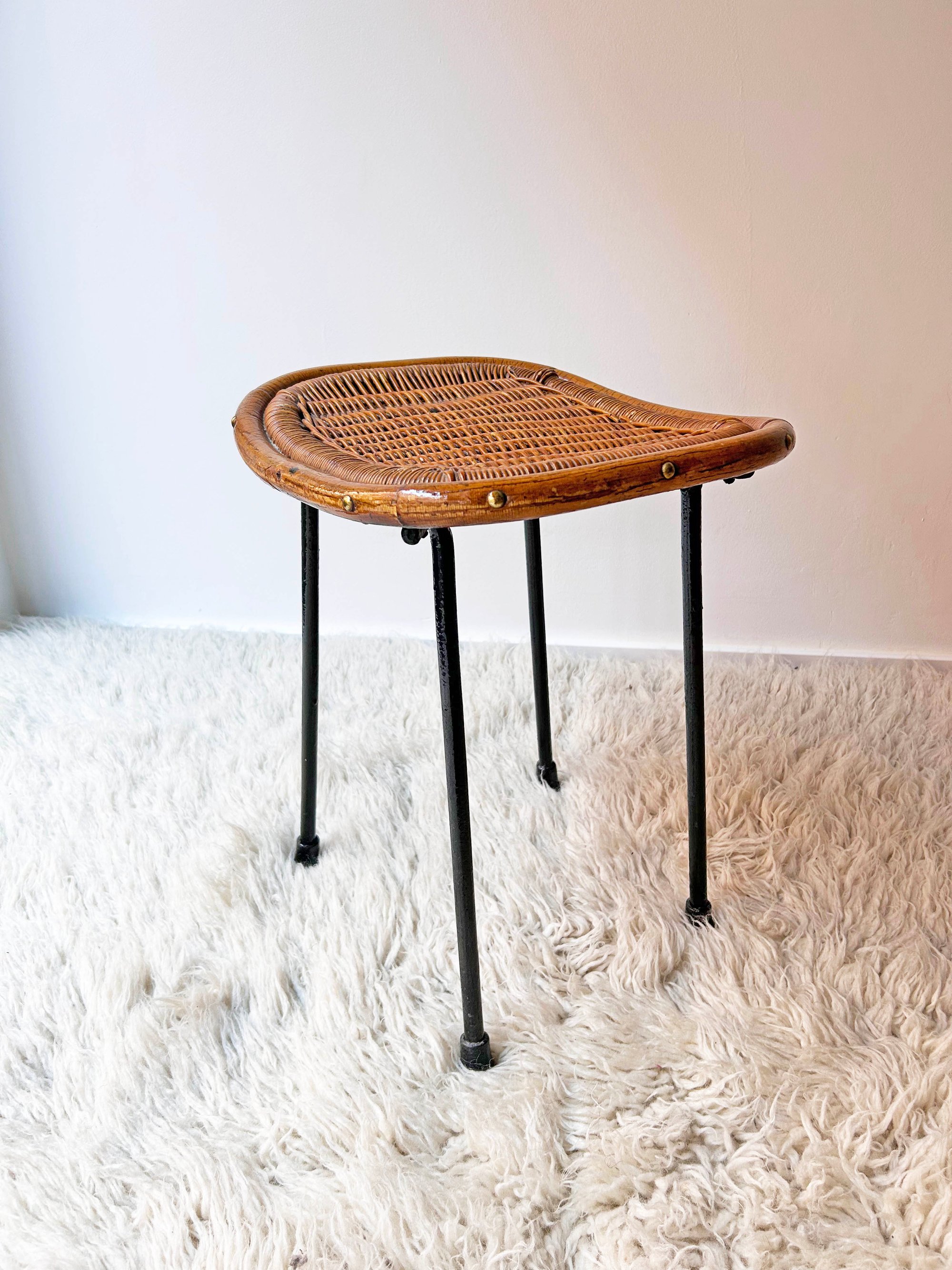 Precioso taburete de mimbre con estructura metálica pintada de negro. La mezcla de materiales de caña y ratán es ideal. Tiene un claro estilo Mid-Century con lineas curvas y aspecto ligero. Recuerda mucho a los diseños del holandés R. Noordwolde de los 50 o los de Danny Ho Fong. Faltas en la fibra y retoques de pintura sin cariño. Pieza con mucha personalidad. Disponible también una pareja de sillas con reposabrazos y una silla de la misma serie.