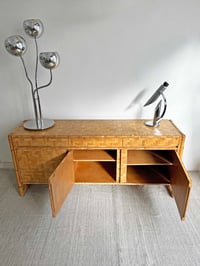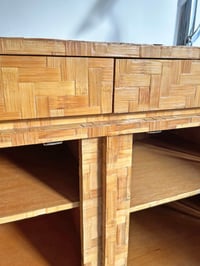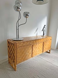 Es espectacular! Exquisito trabajo de tejido de cestería cubriendo la totalidad del mueble. Son pequeñas piezas pegadas creando un bonito dibujo geométrico. Pequeñas faltas en la parte inferior. Tres cajones y tres puertas con estante en el interior que se puede regular. La trasera del aparador también está cubierta con el mismo trabajo, con lo cual puede estar en un espacio exento. Medidas: 170 cm de ancho x 46 cm de fondo x 73 cm de alto.