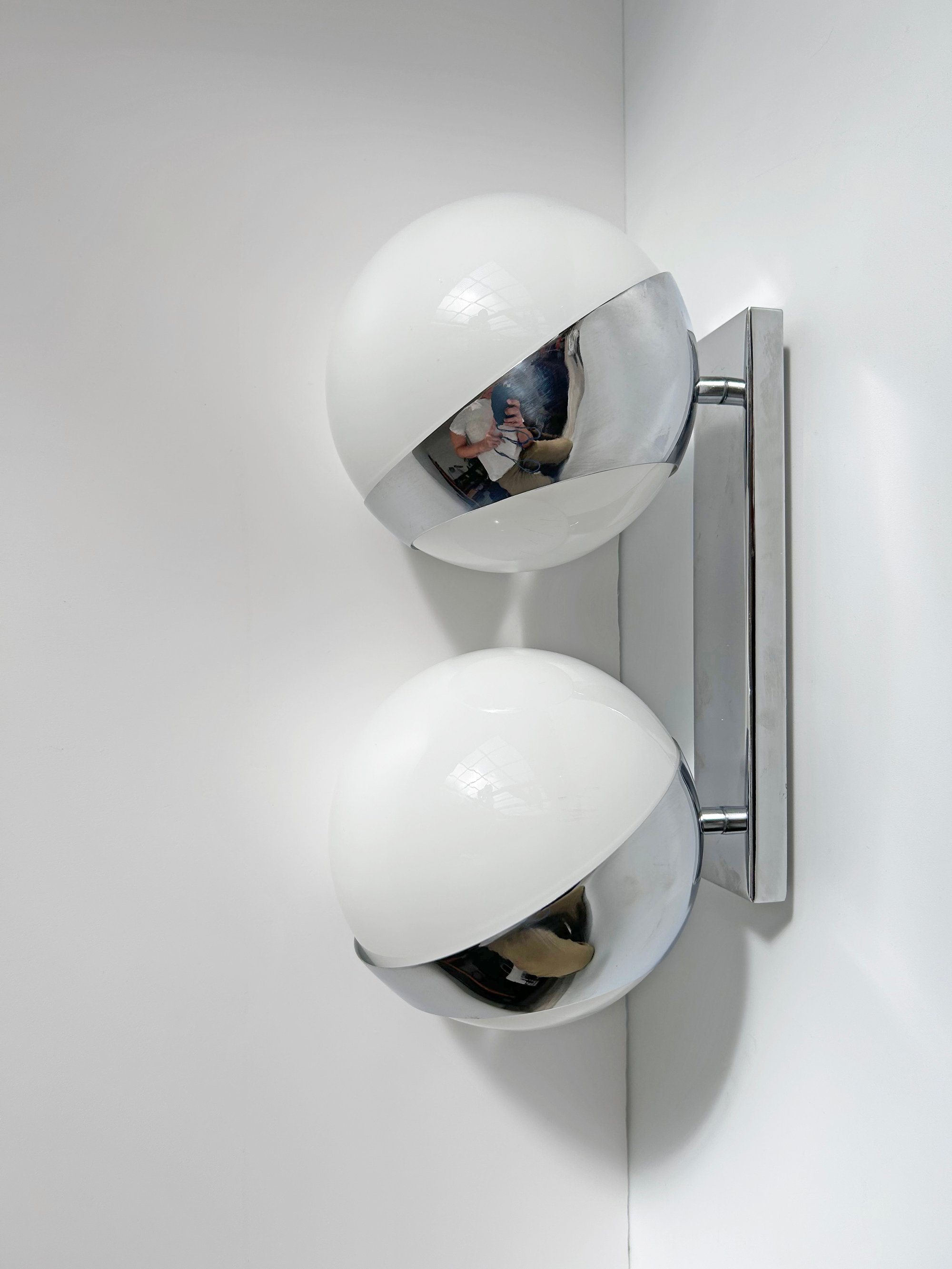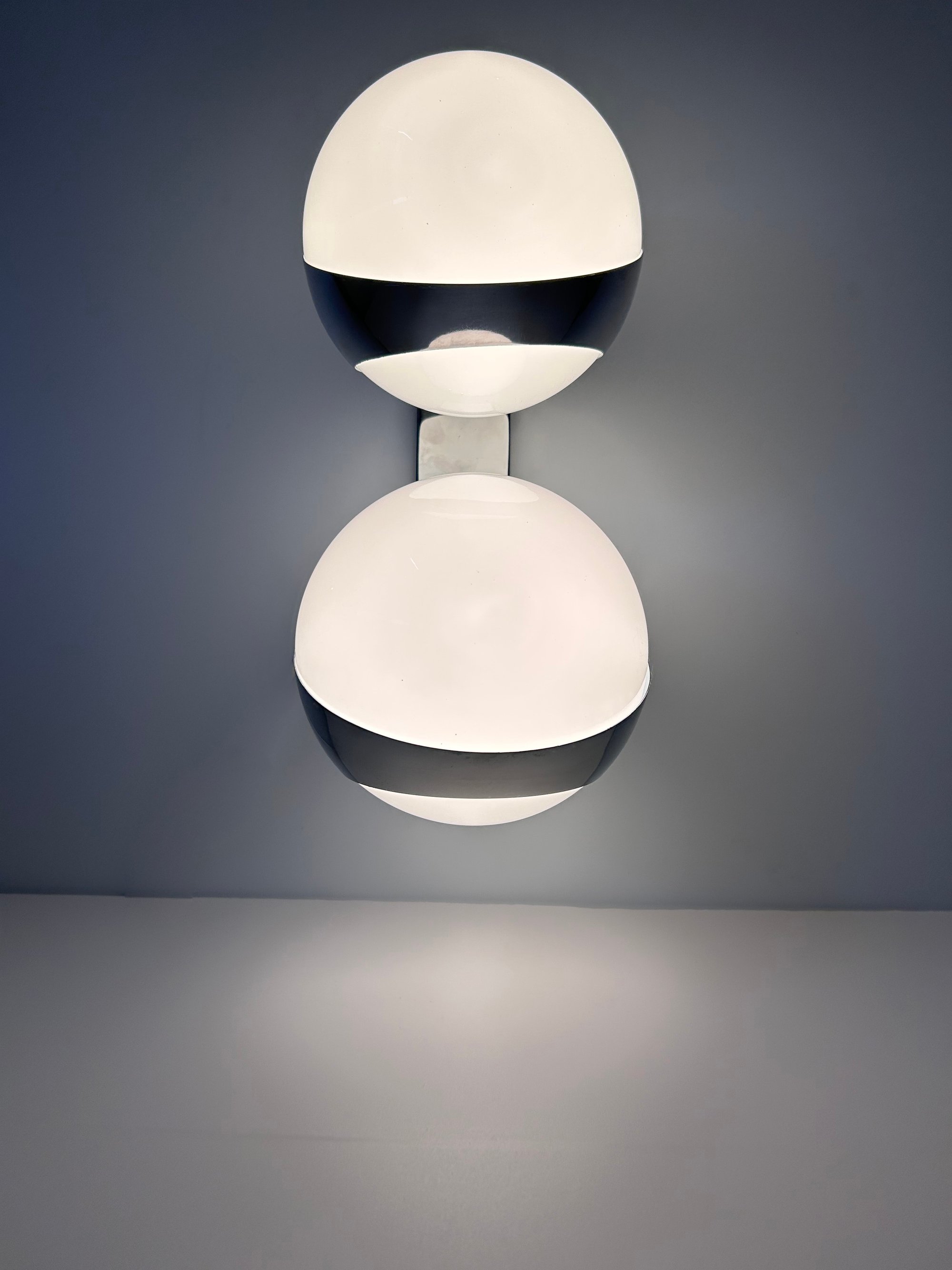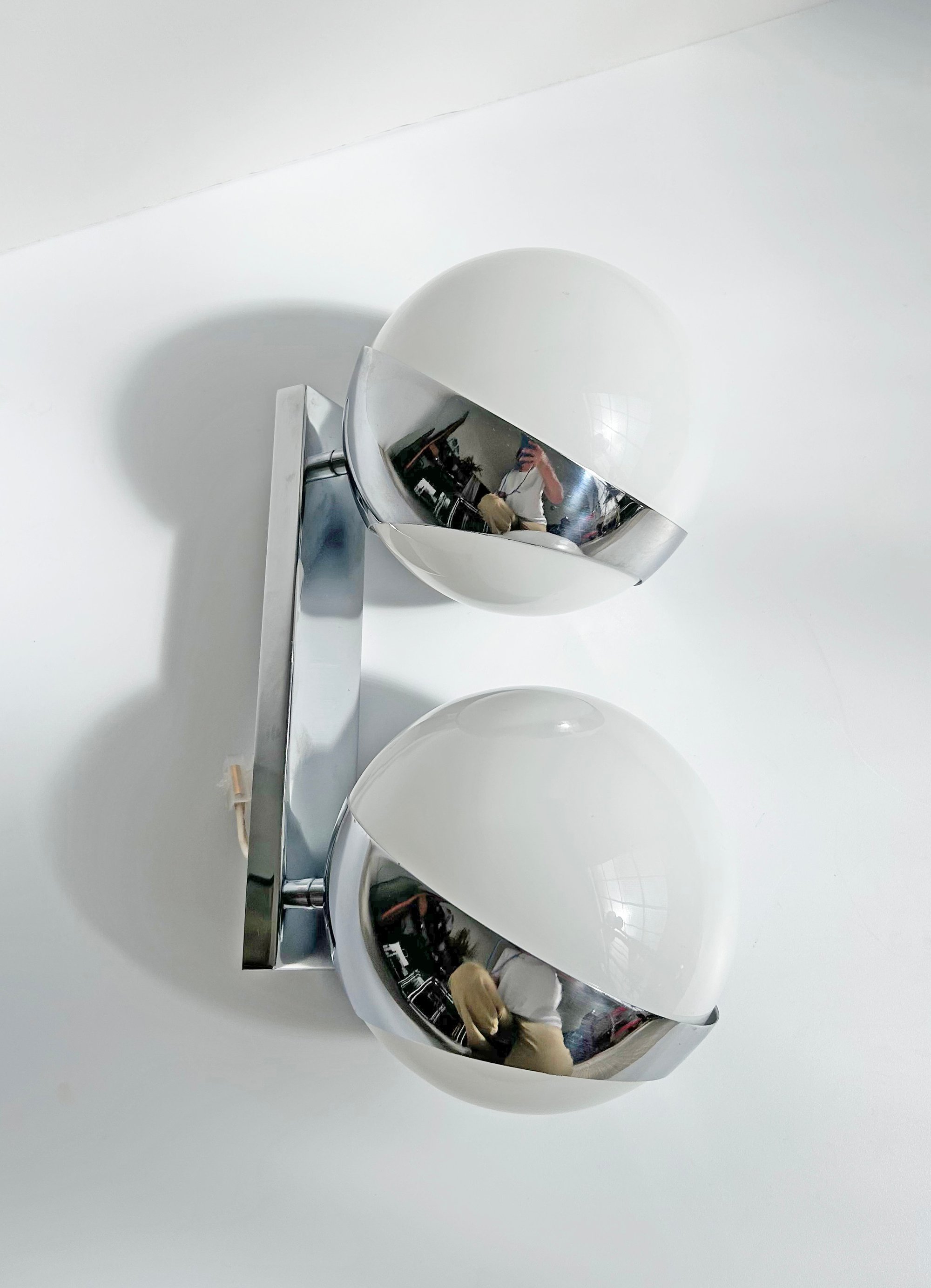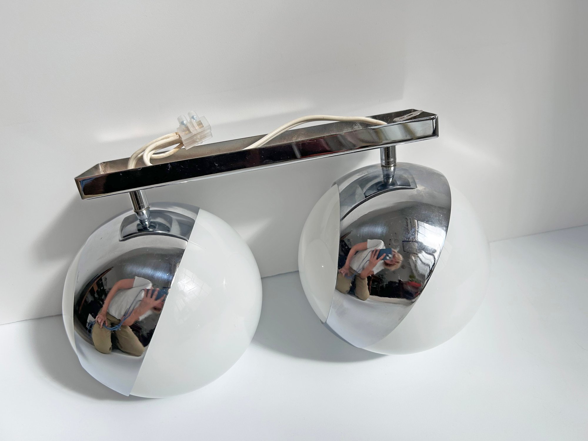Muy original y curioso. Aplique cromado compuesto por dos aros que sujetan dos globos blancos, permitiendo ver luz por arriba y abajo. Parece que la instalación ha sido cambiada. Medidas: 35 cm de alto x 17 cm de ancho x 21 cm de fondo. La placa a pared mide 26 cm de alto x 5,5 cm de ancho. Procedencia: vaciado de piso de Arganzuela, Madrid.