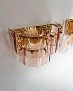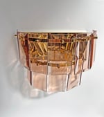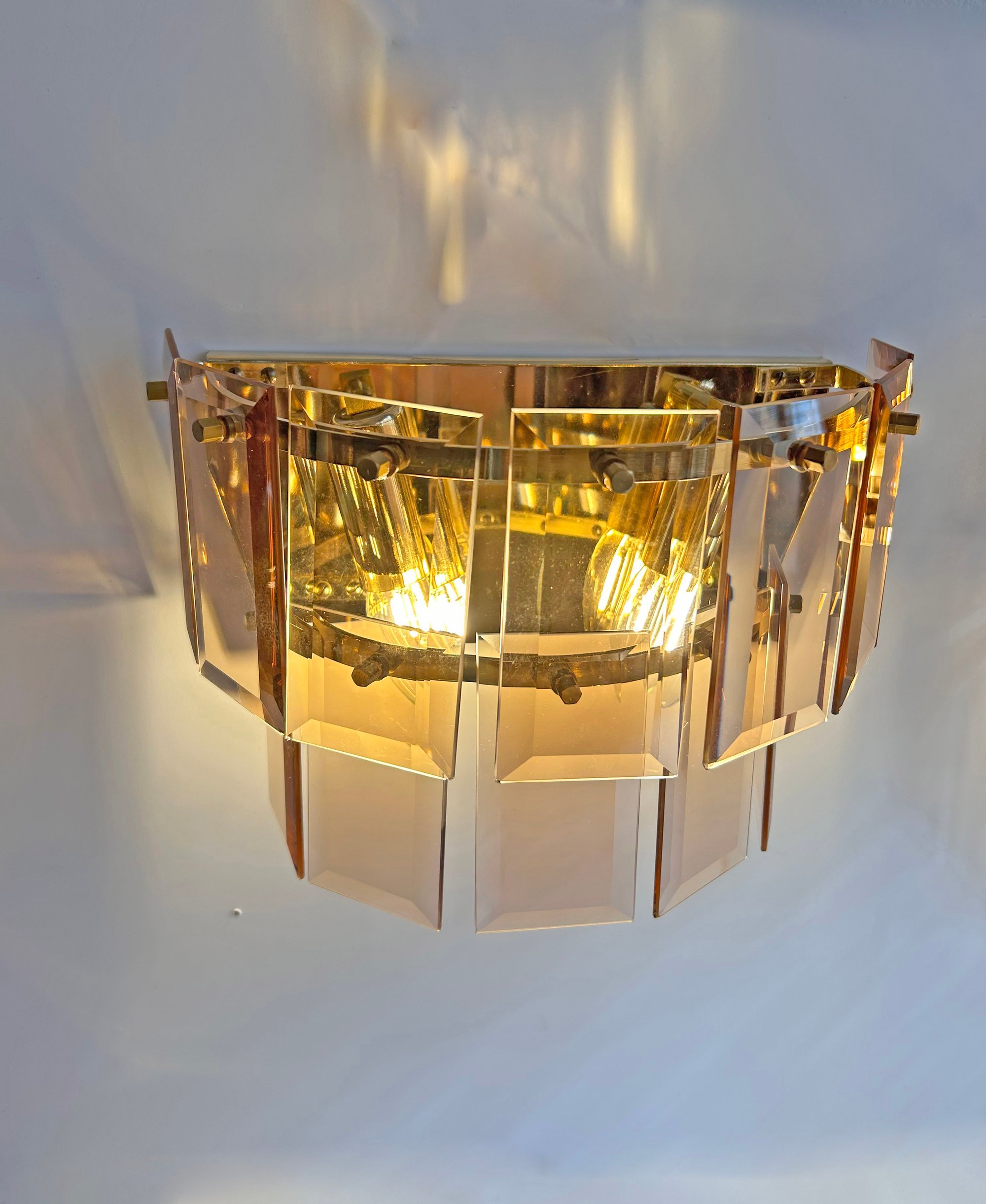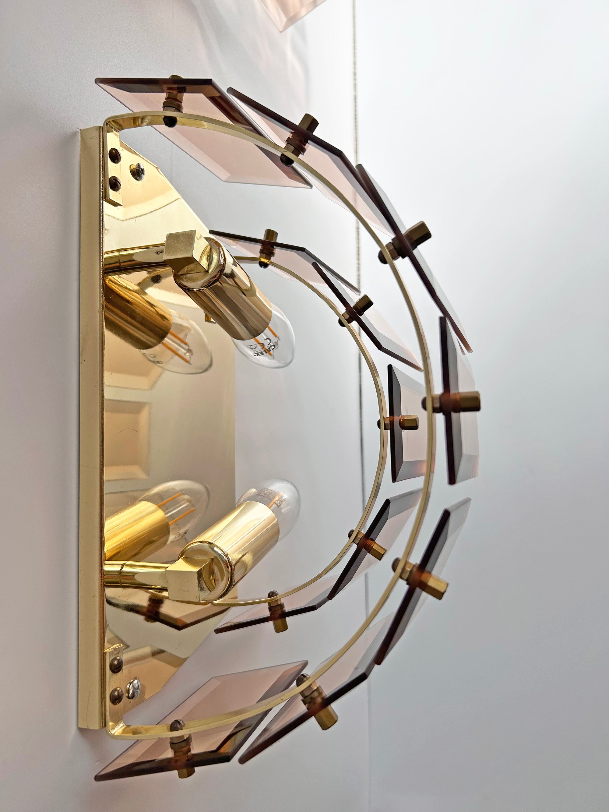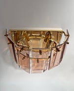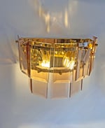 Preciosos apliques con estructura metálica dorada y doble aro donde se sujetan varios cristales ahumados. Algunas muescas en las esquinitas de los vidrios. La instalación eléctrica estaba quemada y ha sido sustituida por completo. Portalámparas E14. Tienen un tamaño majete. Medidas: 30 cm de ancho x 21 cm de alto x 18 cm de fondo. Cada cristal mide 12 cm de alto x 6 cm de ancho.