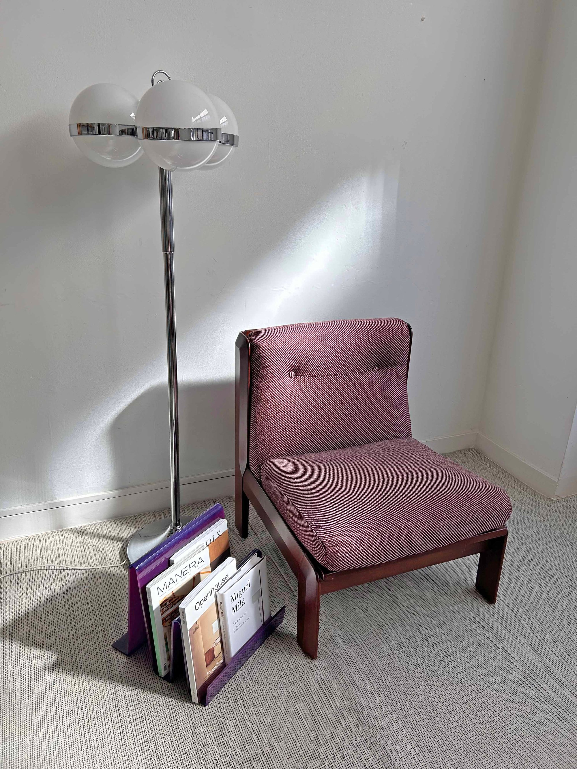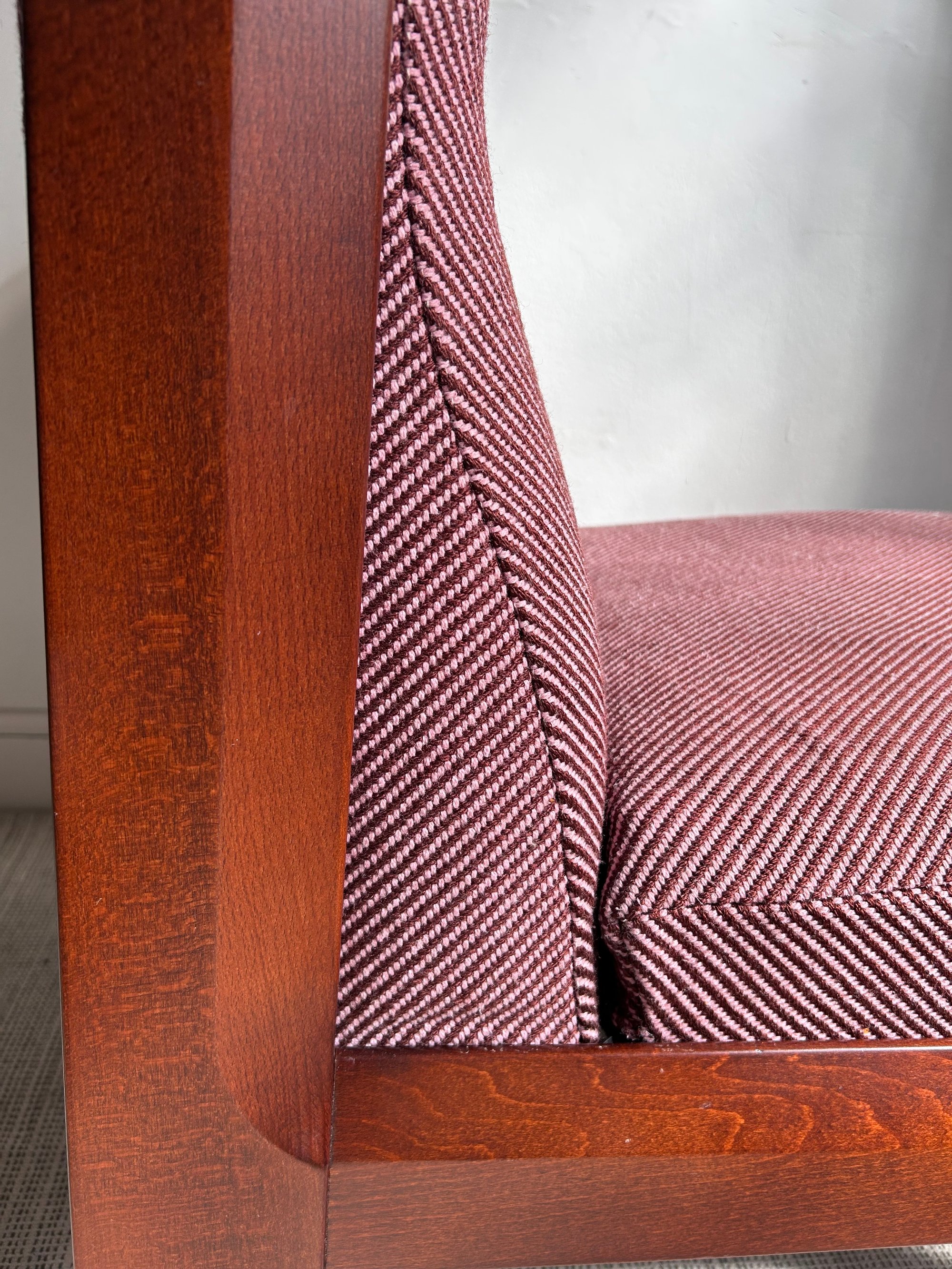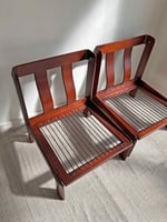 PRECIO UNIDAD. Sillones bajos de la empresa catalana GUILLEUMAS, fundada en 1922. Estructura de haya curvada en el respaldo y tapicería original. Son una joya. Pocas marcas de uso en la estructura. Tirantes del asiento en buen estado. Conservan etiqueta de marca. Miden 74 de alto x 64 de ancho x 74 de fondo. Altura del asiento, 40 cm. ULTIMA UNIDAD DISPONIBLE.