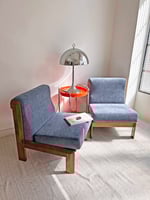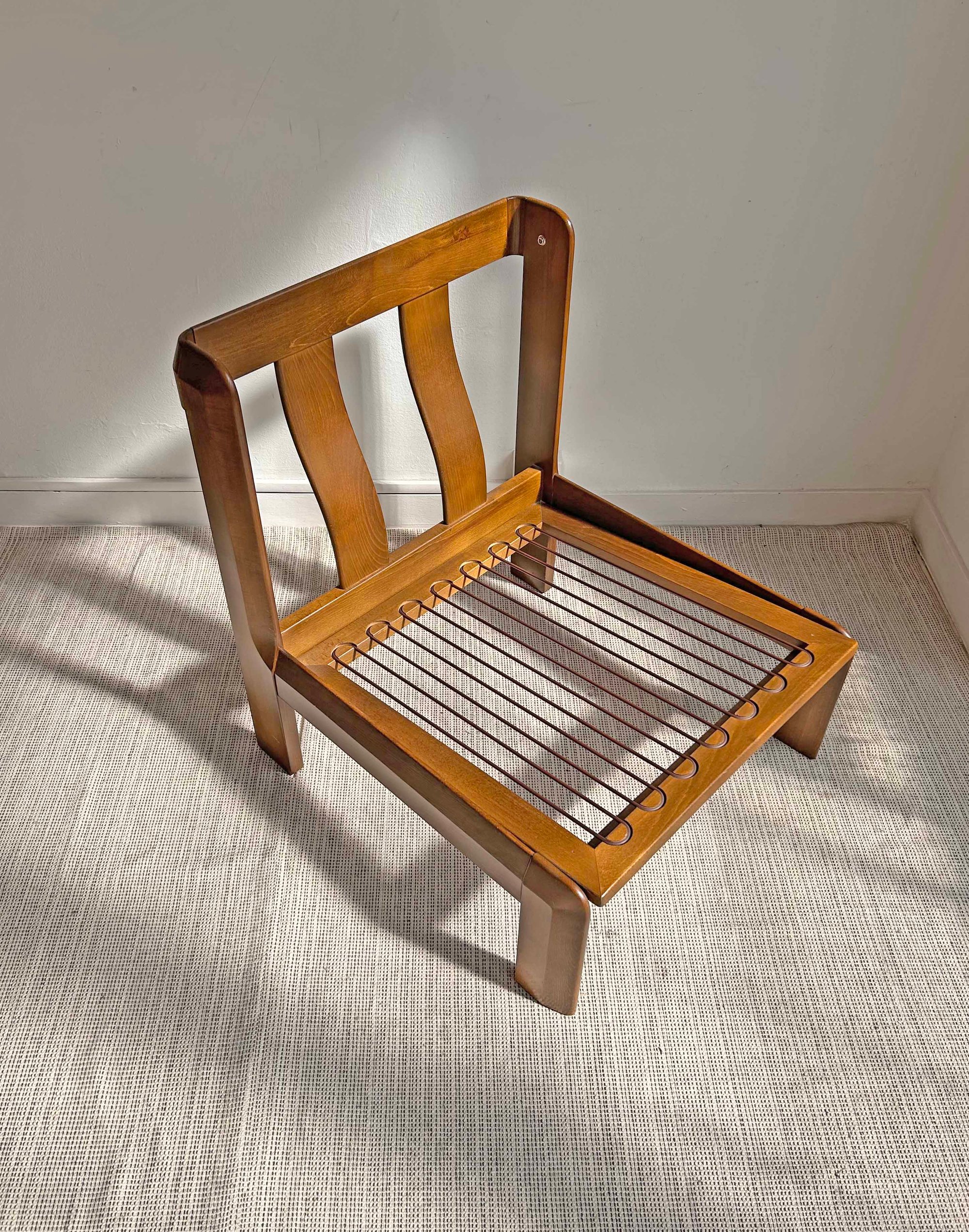 PRECIO UNIDAD. Sillones bajos de la empresa catalana GUILLEUMAS, fundada en 1922. Estructura de haya, con curva en el respaldo y sistema de tirantes en el asiento. Tapicería y espuma completamente nuevas. Son una joya. Pocas marcas de uso en la estructura. Conservan etiqueta de marca. Miden 74 de alto x 64 de ancho x 74 de fondo. Altura del asiento, 40 cm.