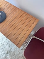 Patas metálicas en negro y el resto es madera. El sobre es de listones de haya y tenía muchas manchas, restos de pegamento, y un barniz en muy mal estado. Se ha quedado increible. Hay una mancha que parece de un cigarrillo que la he suavizado mucho. El frente de los cajones está forrado de ratán. Marcas de uso en las patas. Interior de los cajones en muy buen estado.