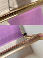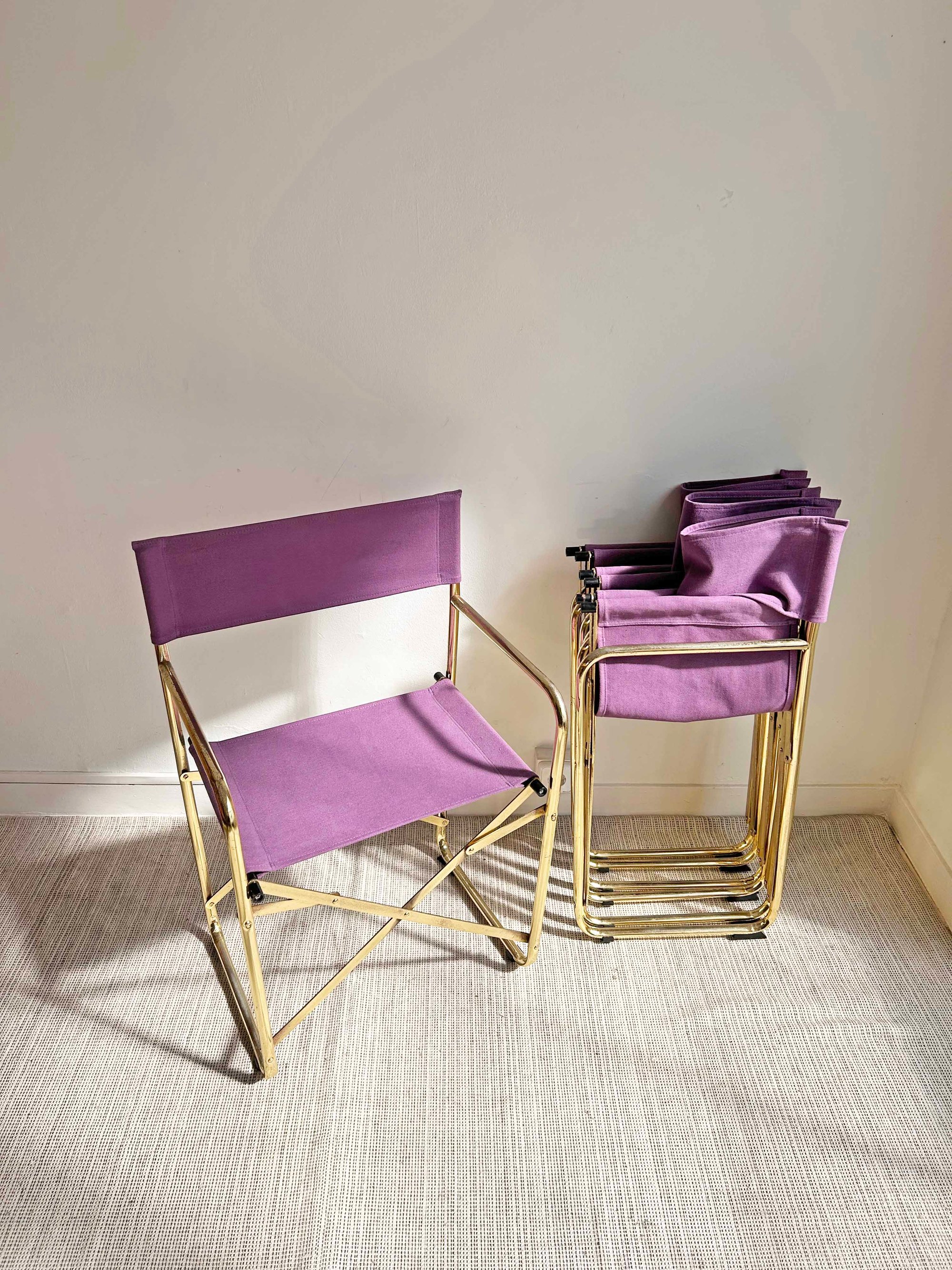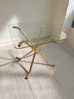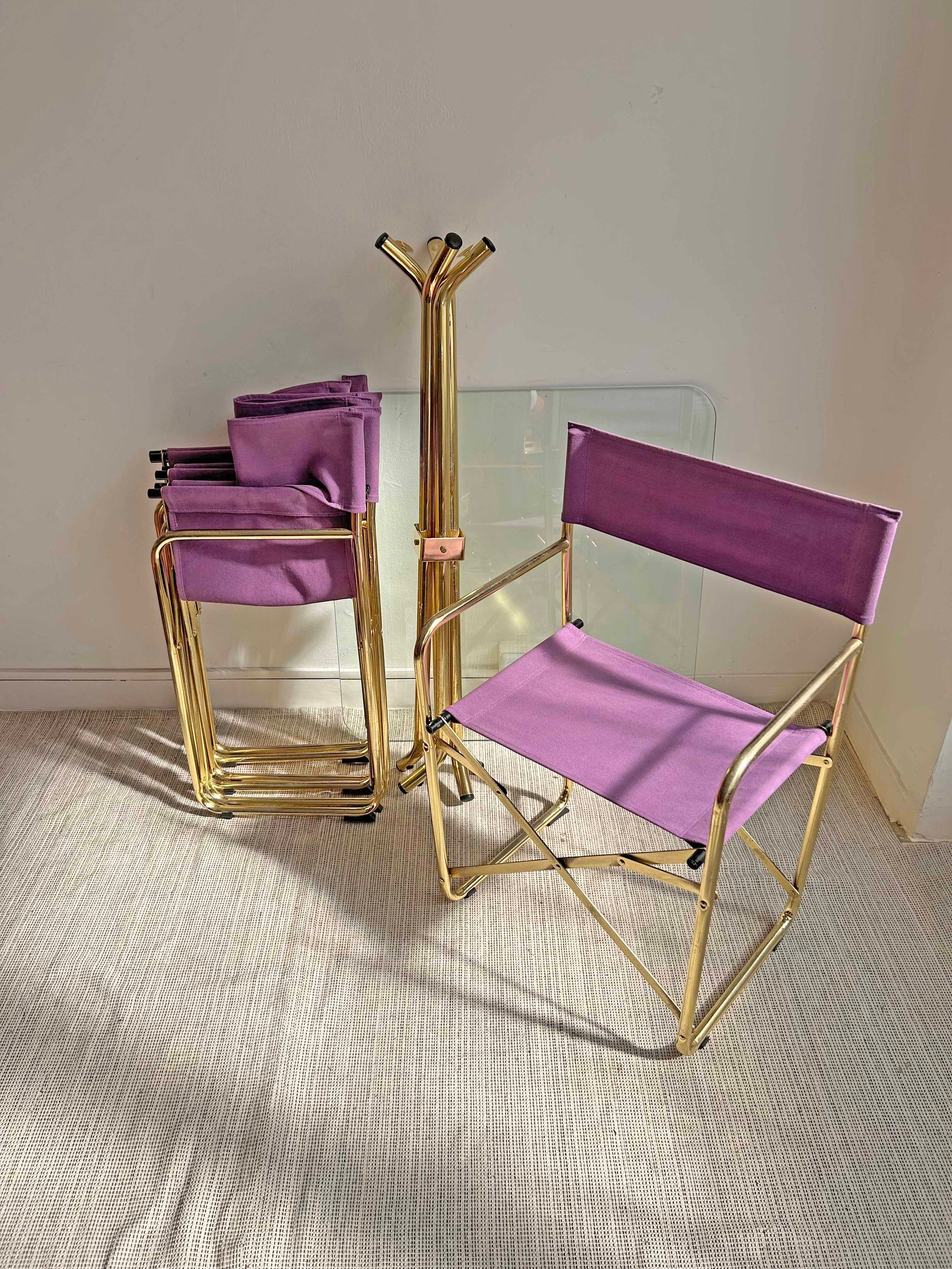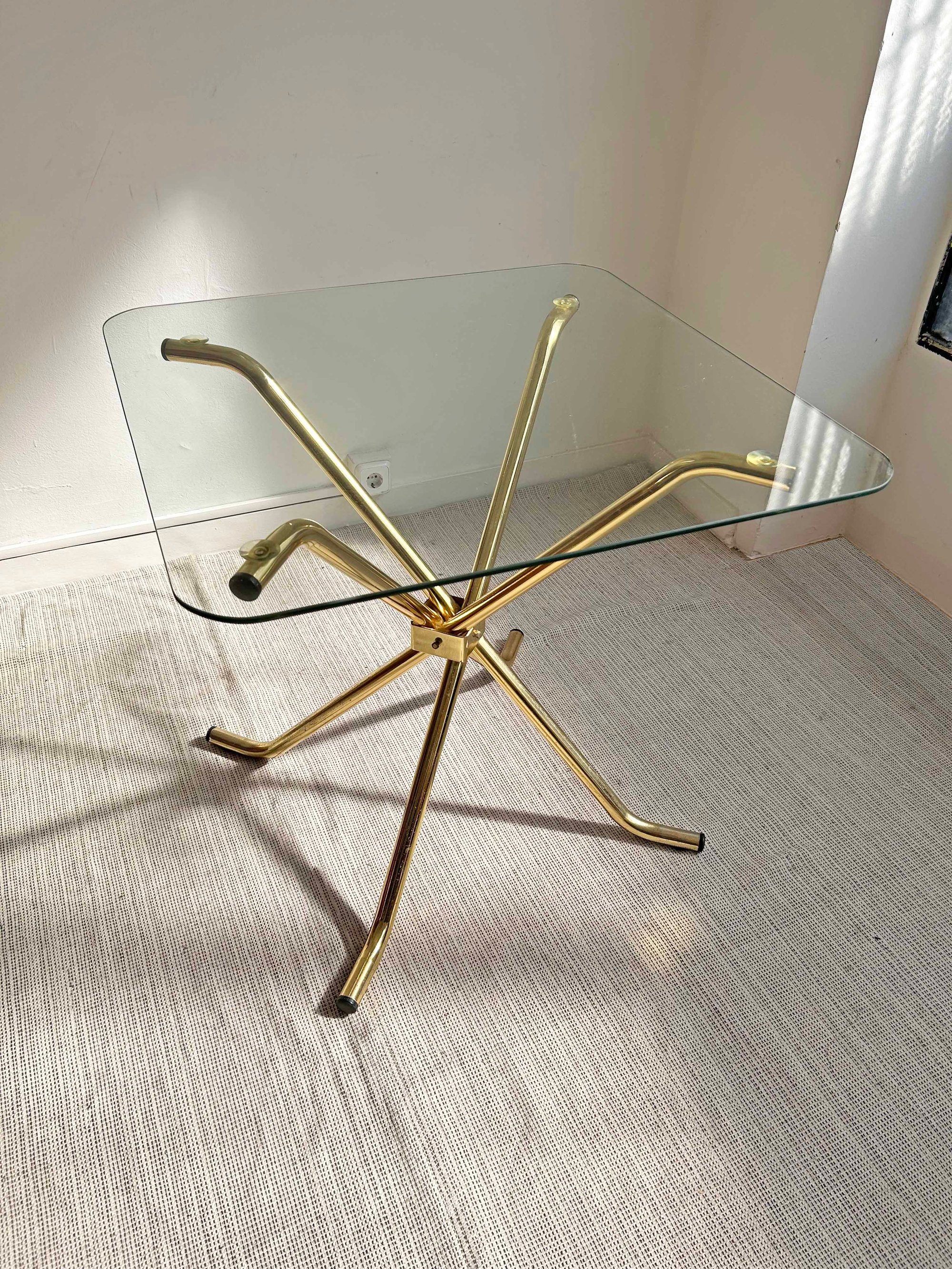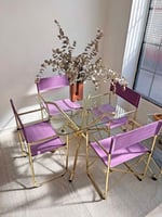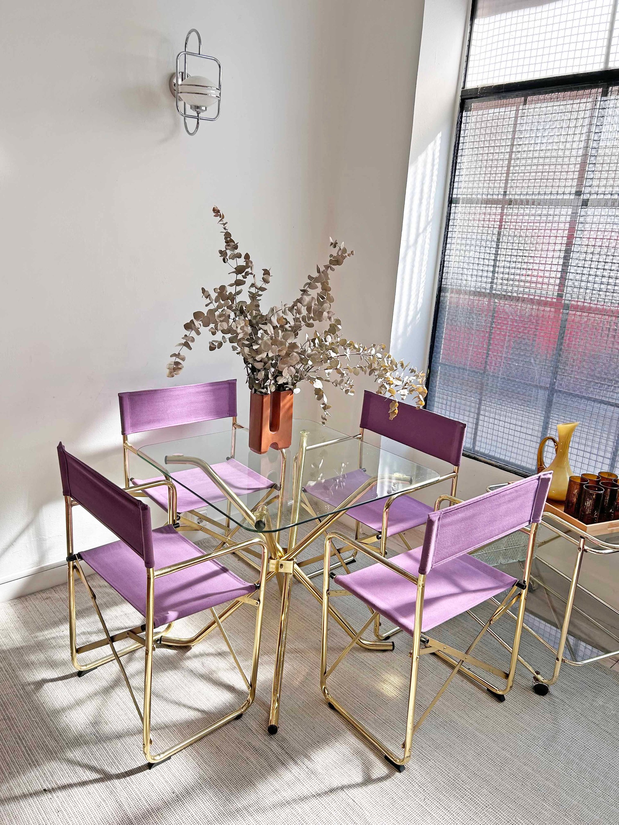 Ideal para espacios reducidos o para tenerlo guardado para complementar. Estructura metálica tubular dorada. Tapicería nueva. Múltiples marcas y pérdida de dorado en zonas. La tapicería se puede desmontar para limpieza. Medidas: Mesa: 72 cm de alto x 80 cm de ancho x 80 cm de fondo. Sillas: 84 cm de alto x 55 cm de ancho x 41 cm de fondo; altura del asiento: 46 cm. Procedencia: Málaga.