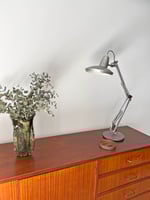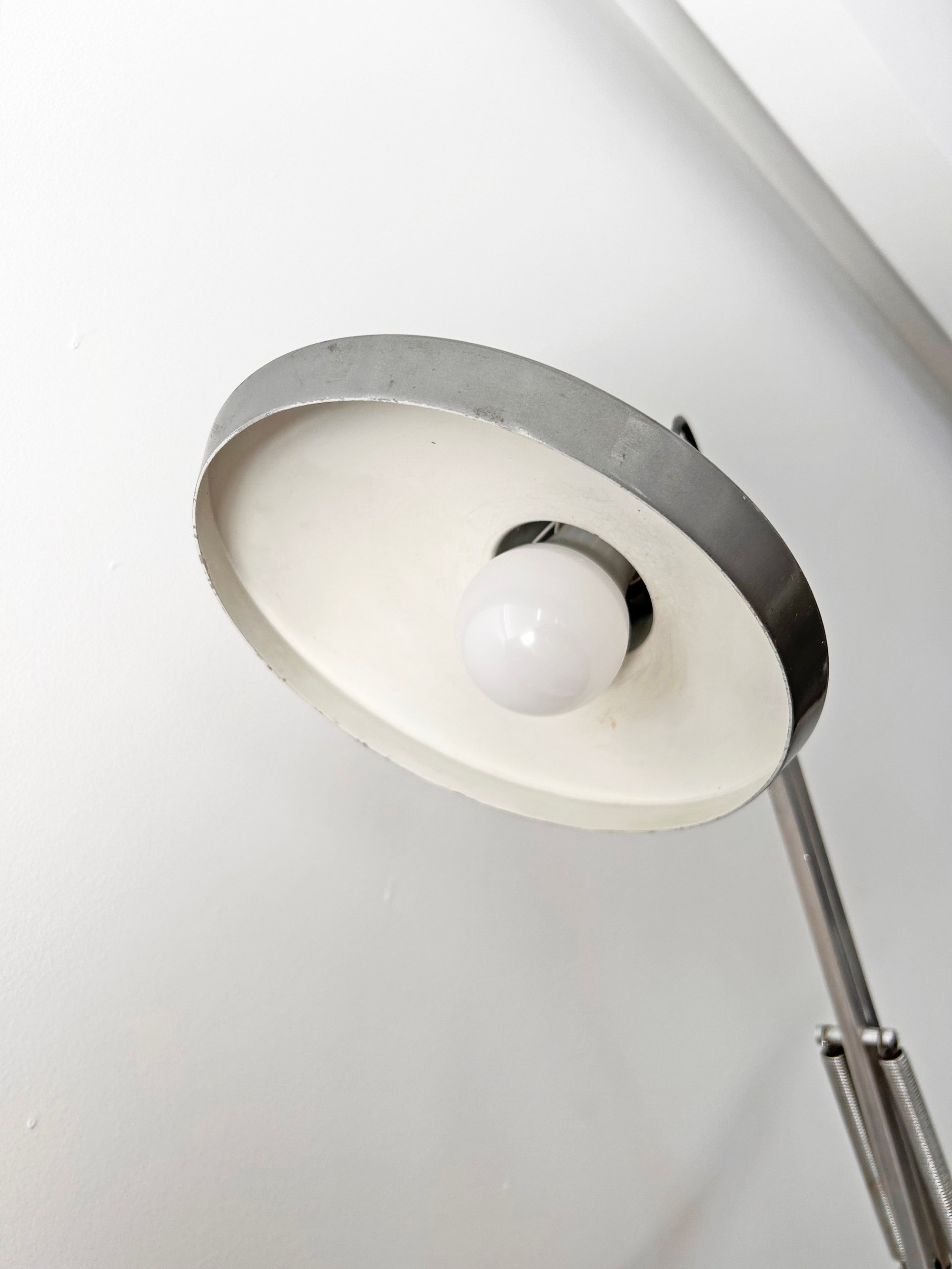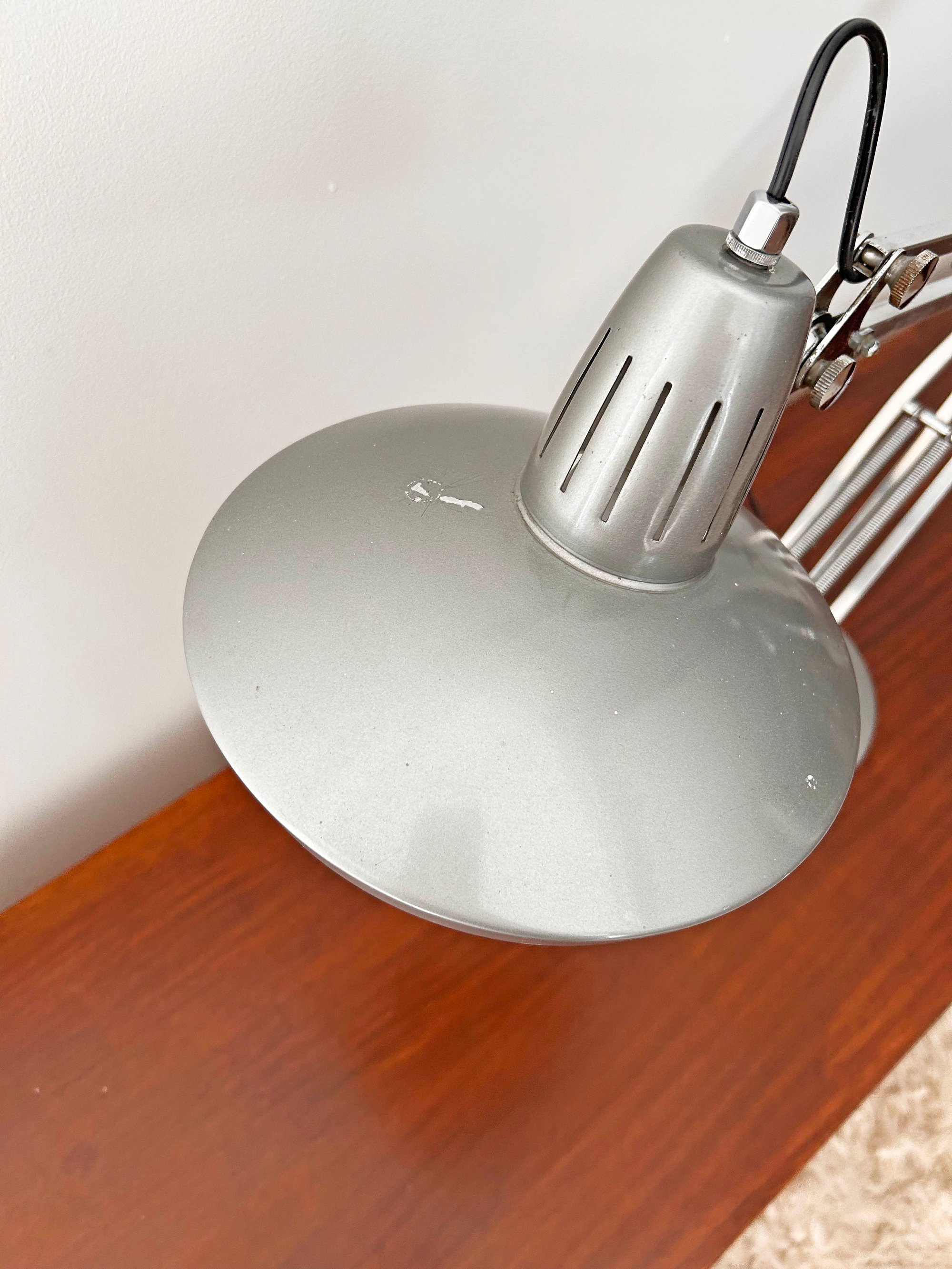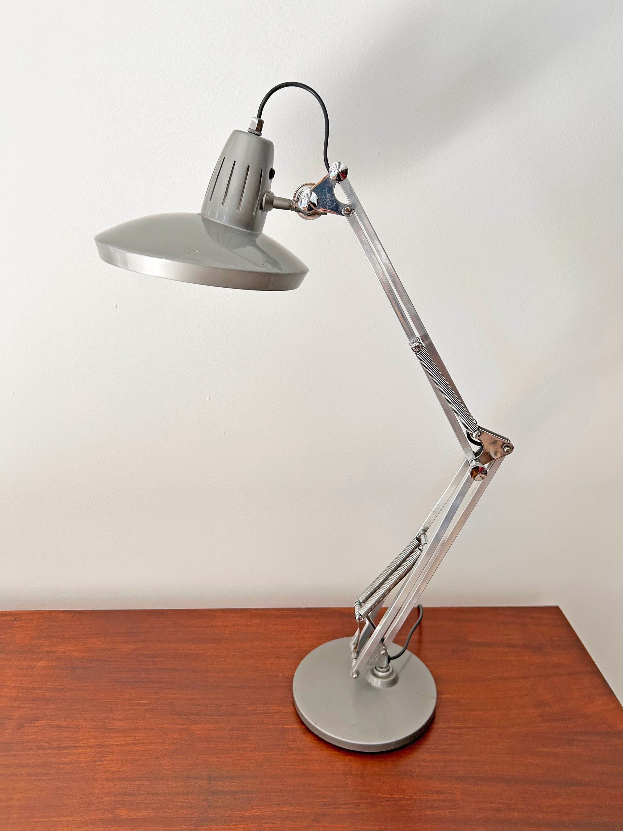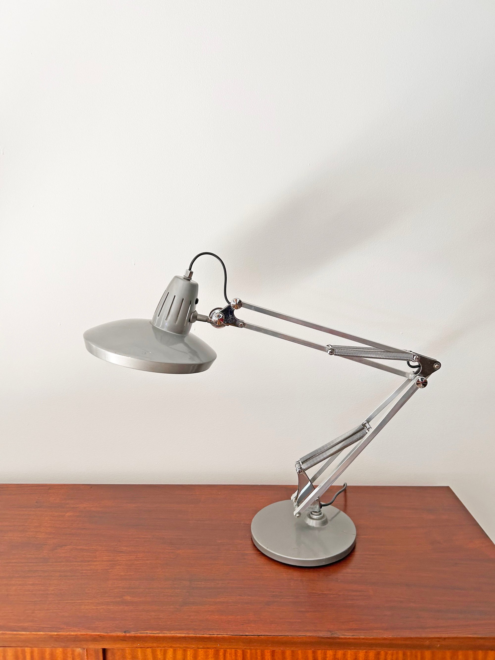 Precioso flexo de mesa de la marca madrileña, FASE. Lámpara metálica de sobremesa articulada en todas direcciones, lacada en gris y con las piezas cromadas. Alguna marca del paso del tiempo. El cableado no es el original. Logotipo en una de las piezas.