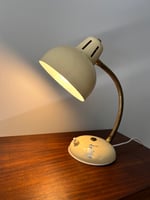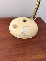 Puede que sea de la marca francesa, Aluminor. Brazo metálico flexible en color dorado. Piezas lacadas en beis. Marca en la base. Interruptor funcionando. La instalación eléctrica parece actualizada. Portalámparas E27. Tiene un tamaño pequeño. Altura máxima 38 cm.