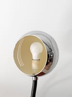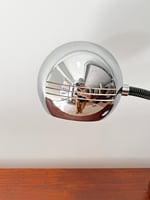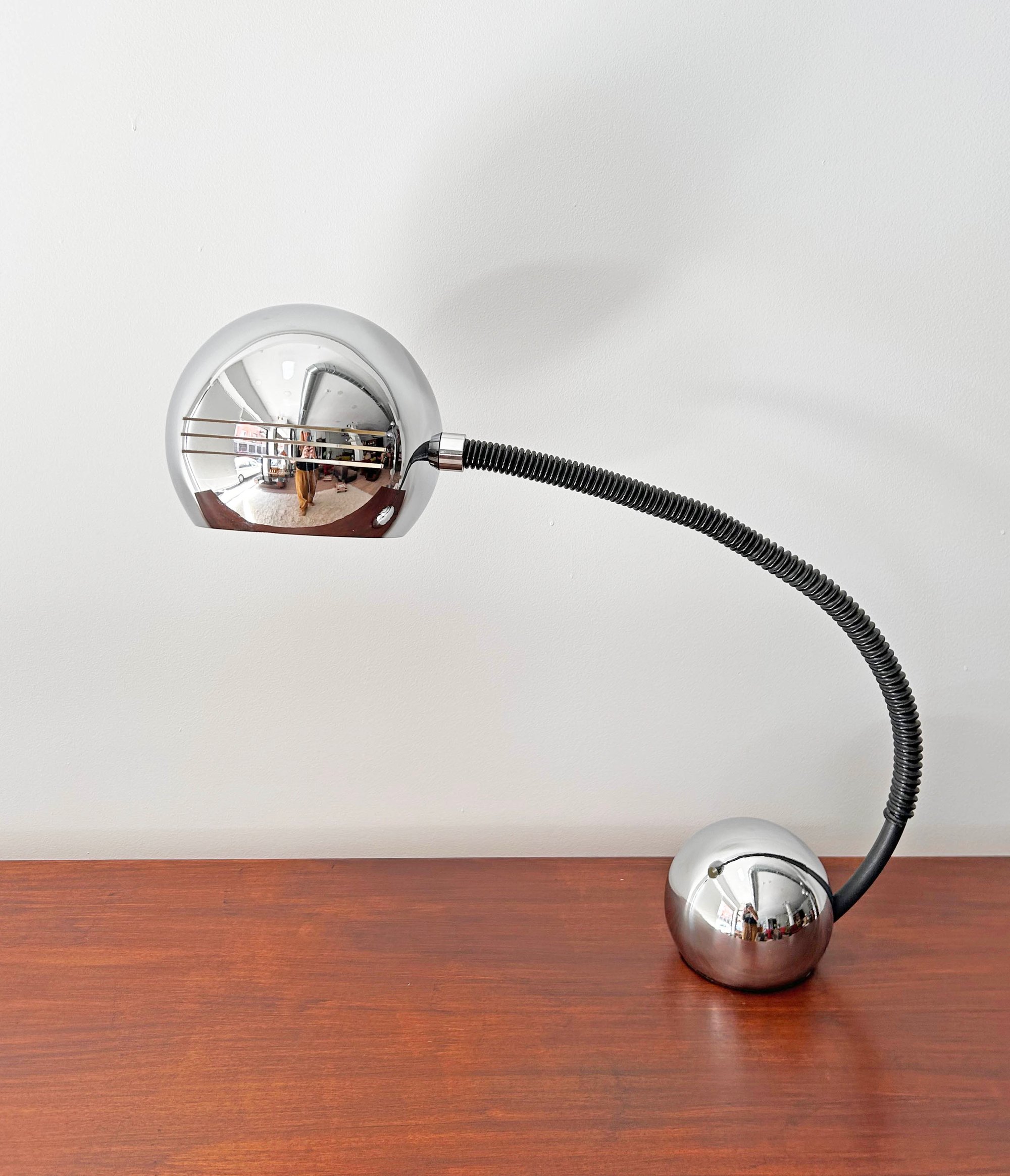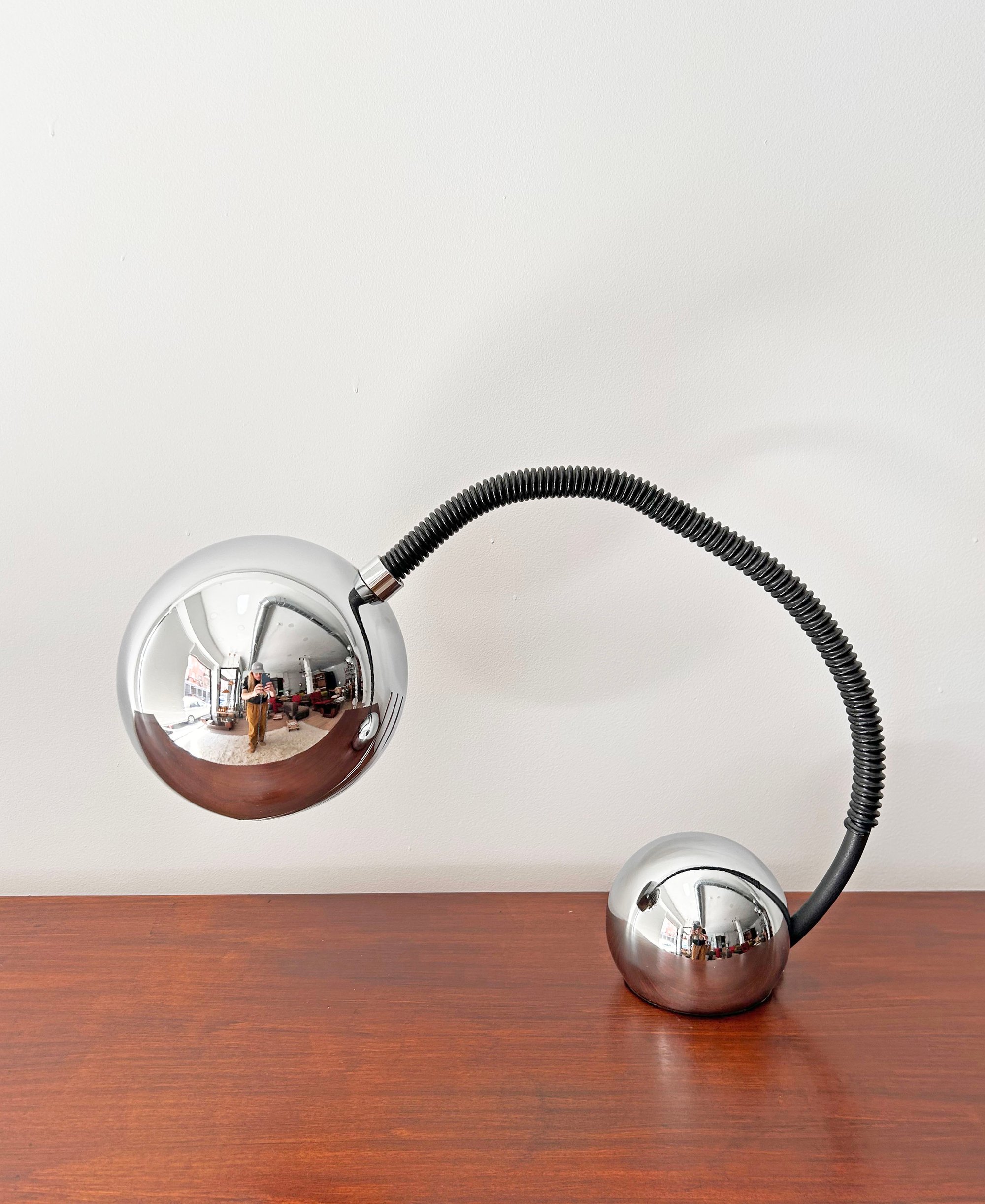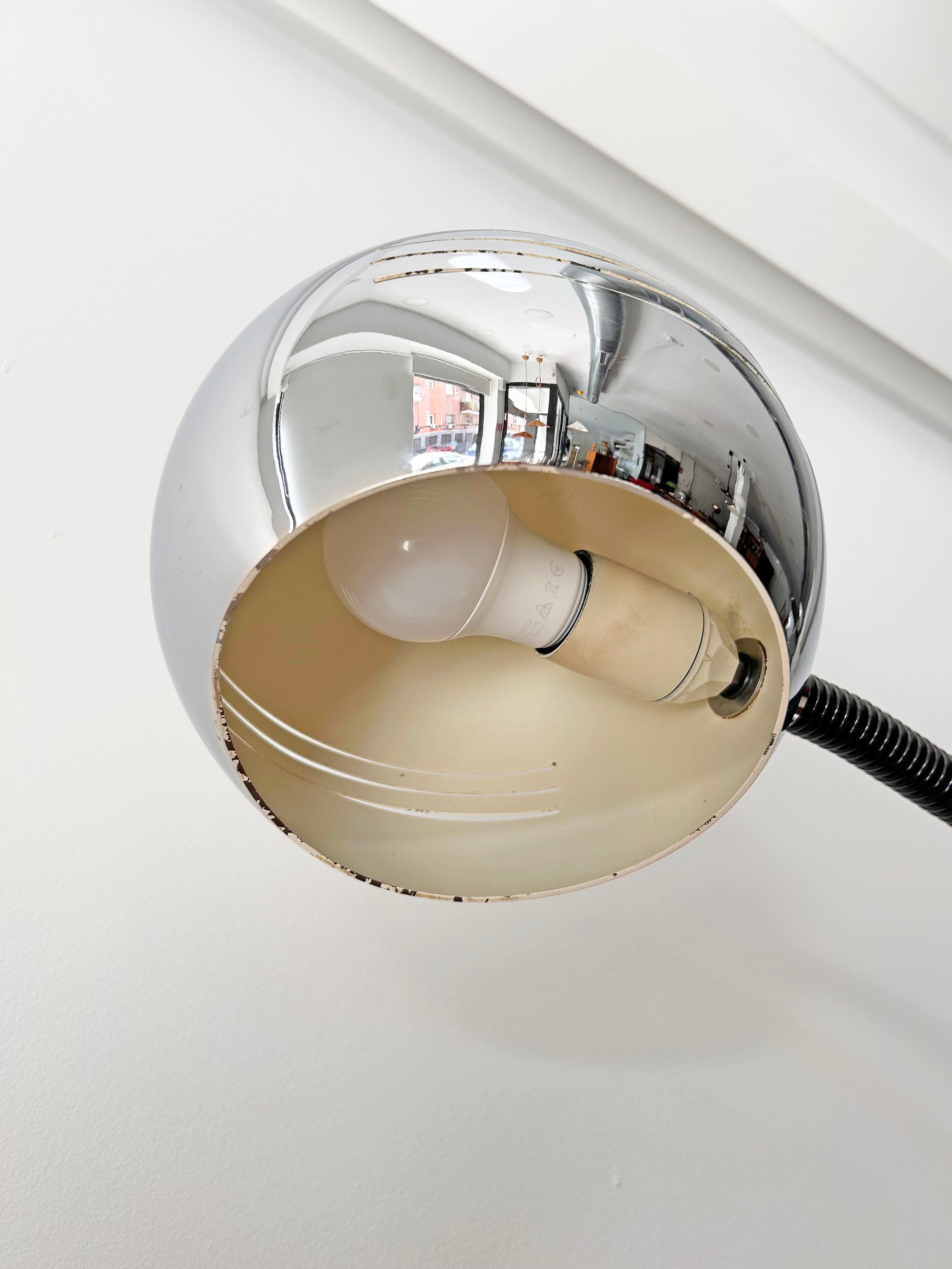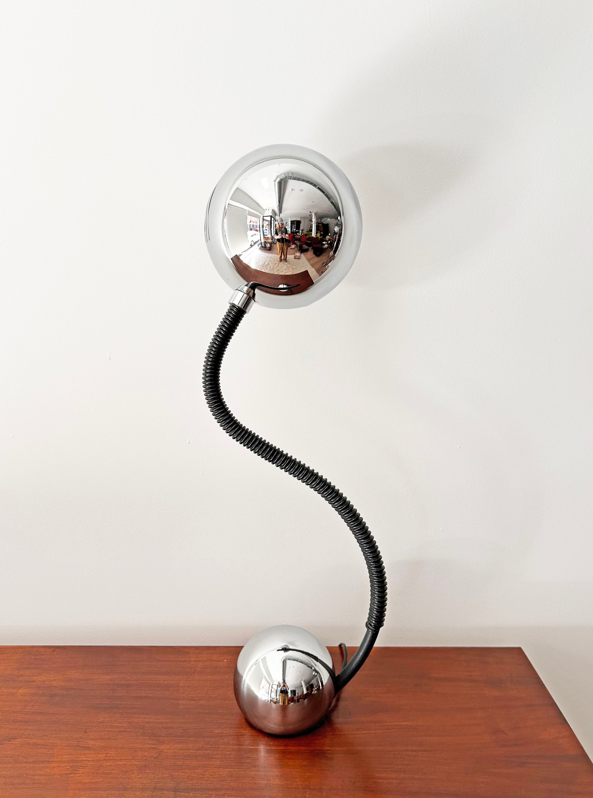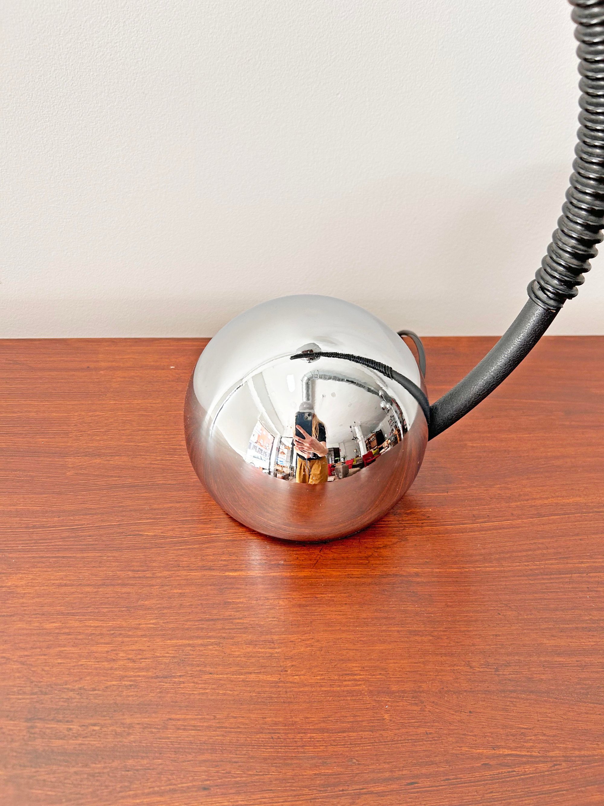 Es divino. Base y pantalla con forma esférica, y brazo flexible que permite multiposición. El globo permite dirigir la luz. Es como una escultura. Eyeball cromado con tres ranuras laterales. Marcas lógicas de la edad. Portalámparas E27. Medidas: altura máxima 80 cm; diámetro eyeball 20 cm. Tiene un tamaño majete.