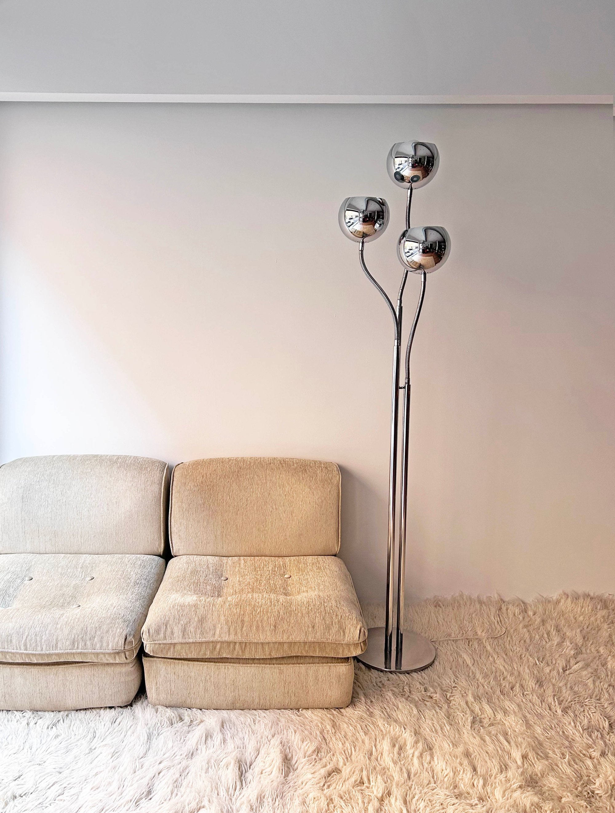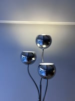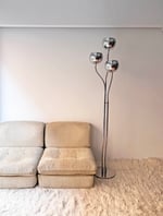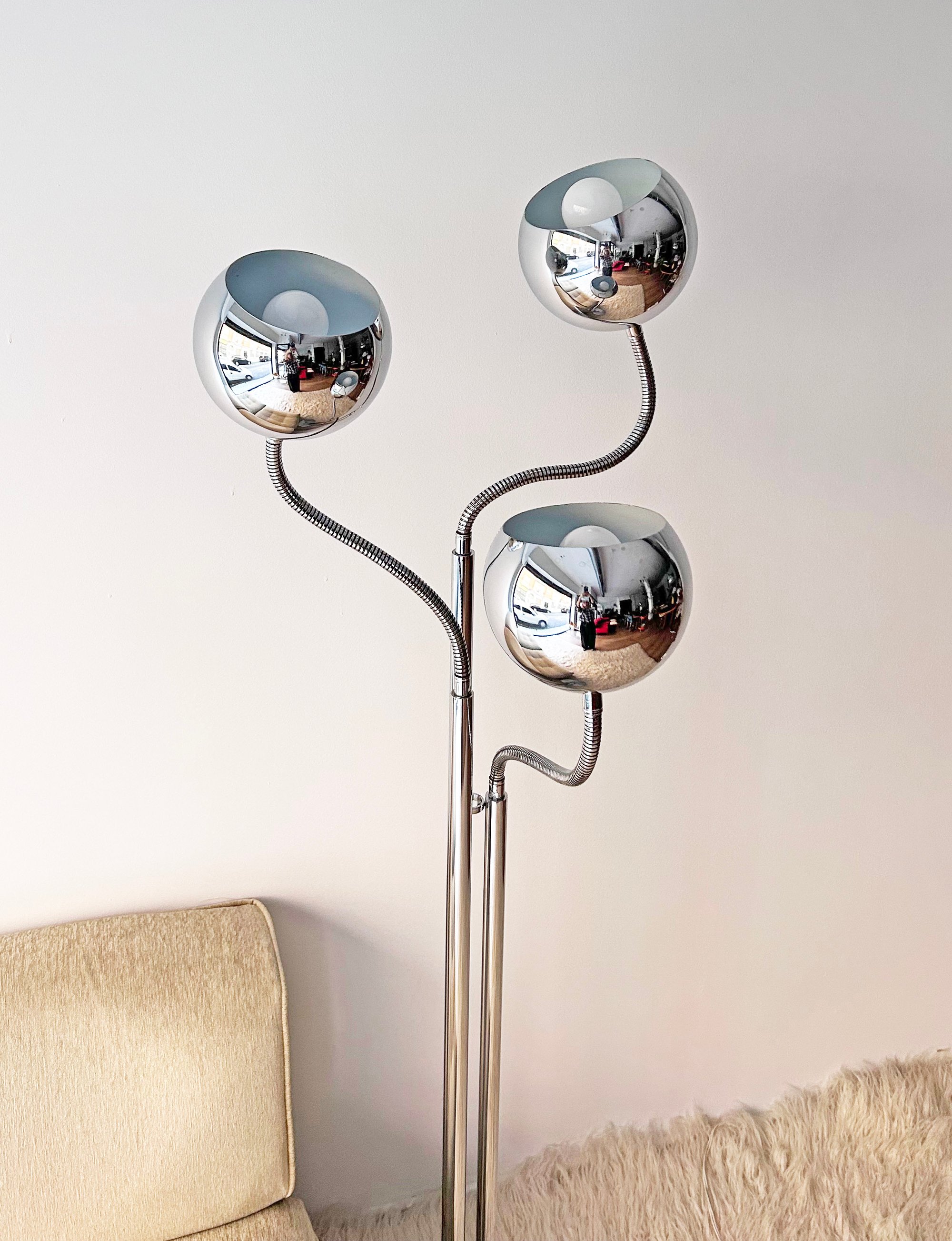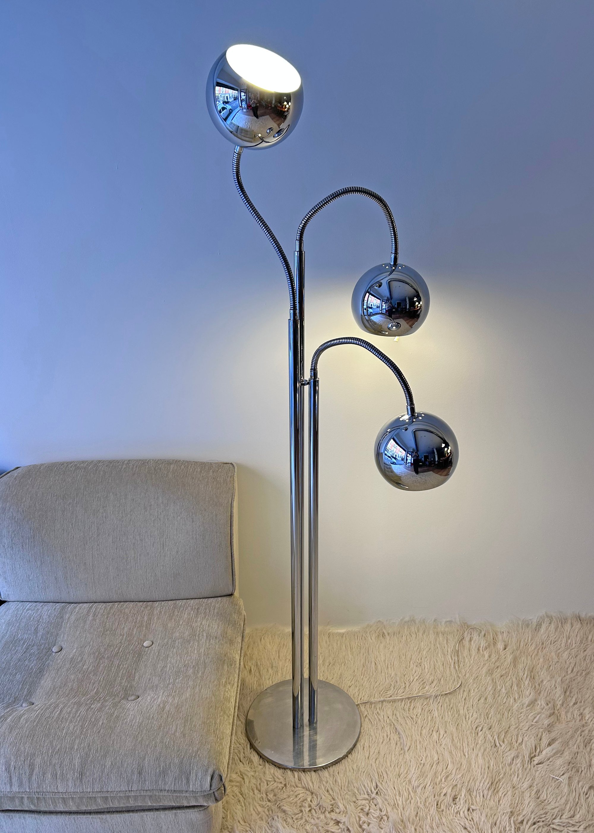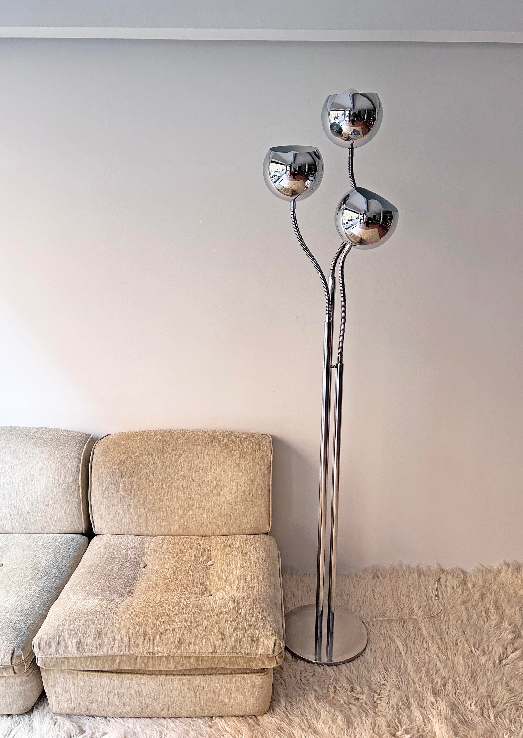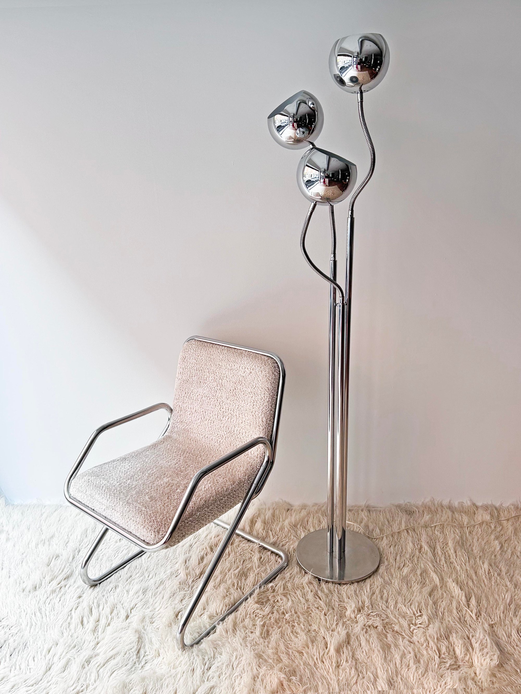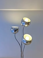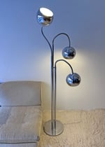 Preciosa. No te cansarás nunca de ella. Lámpara ESTILUZ, de la marca catalana que creó piezas muy interesantes en la década de los 70. Estructura de tres mástiles cromados con tres brazos flexibles para poder dirigir la luz de los focos. Marcas lógicas del paso del tiempo. Uno de los casquillos es más alto que los otros dos, probablemente algún arreglo. Medidas: 170 cm de alto; 32 cm de diámetro en la base.