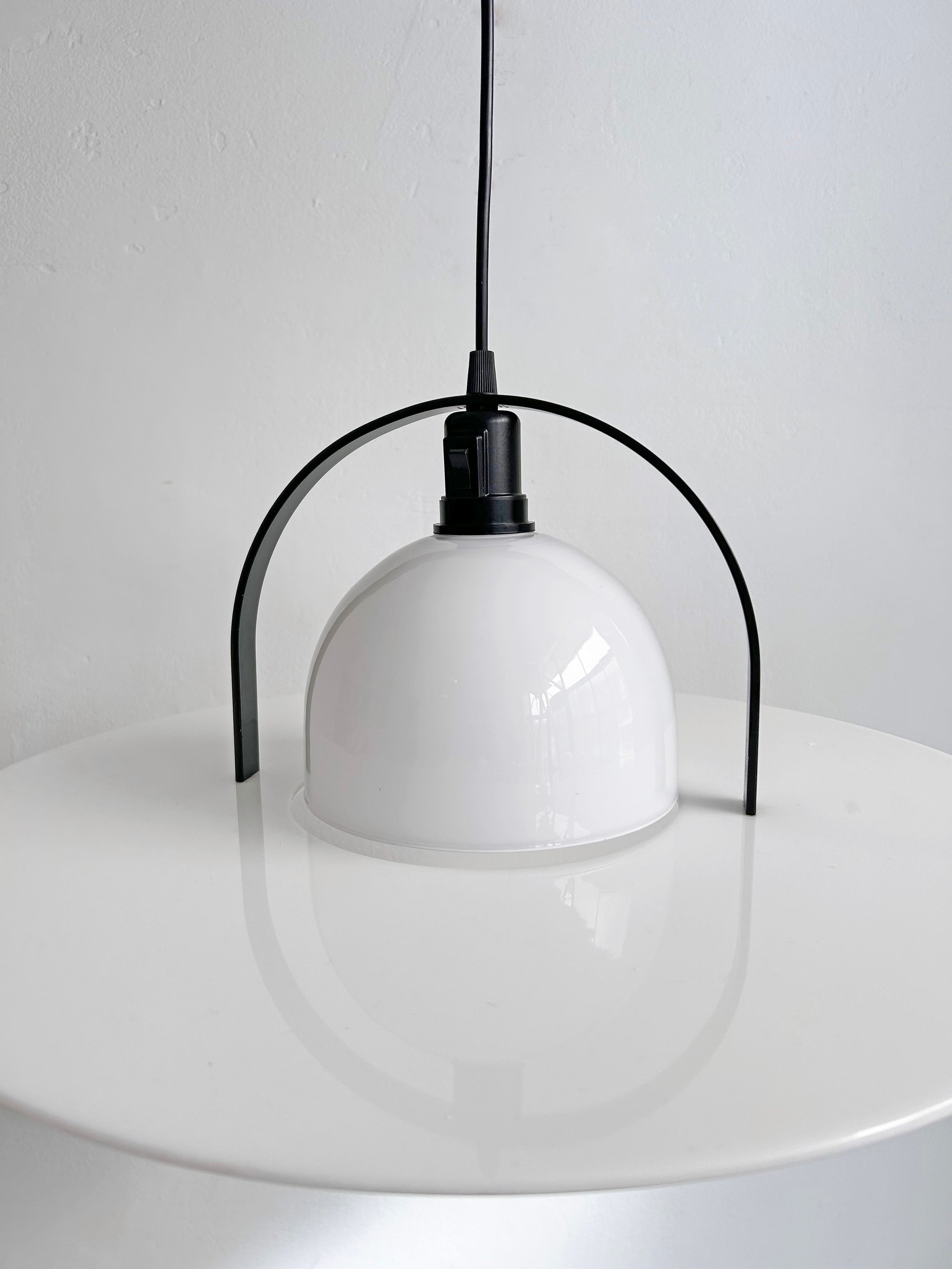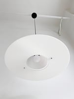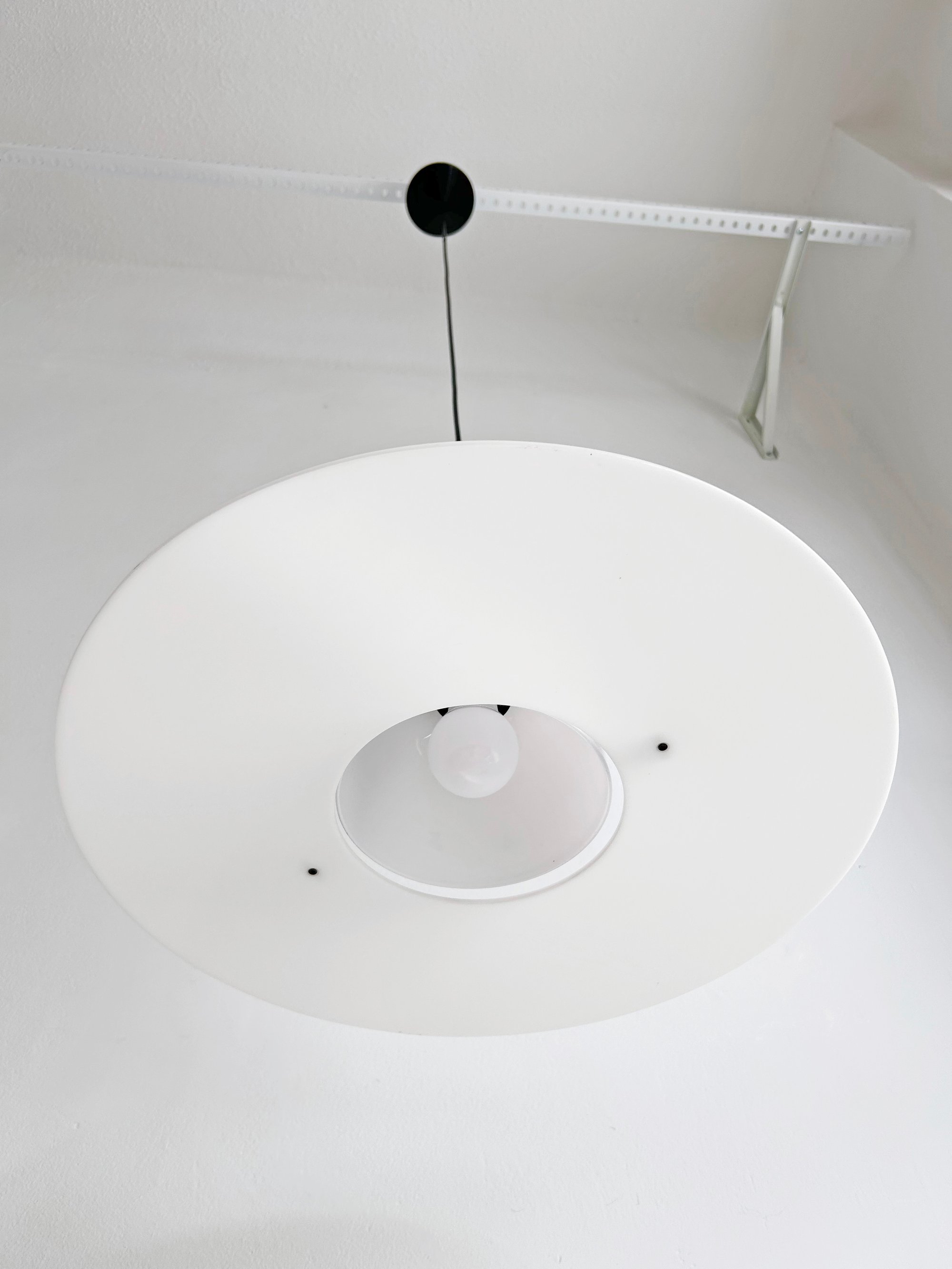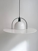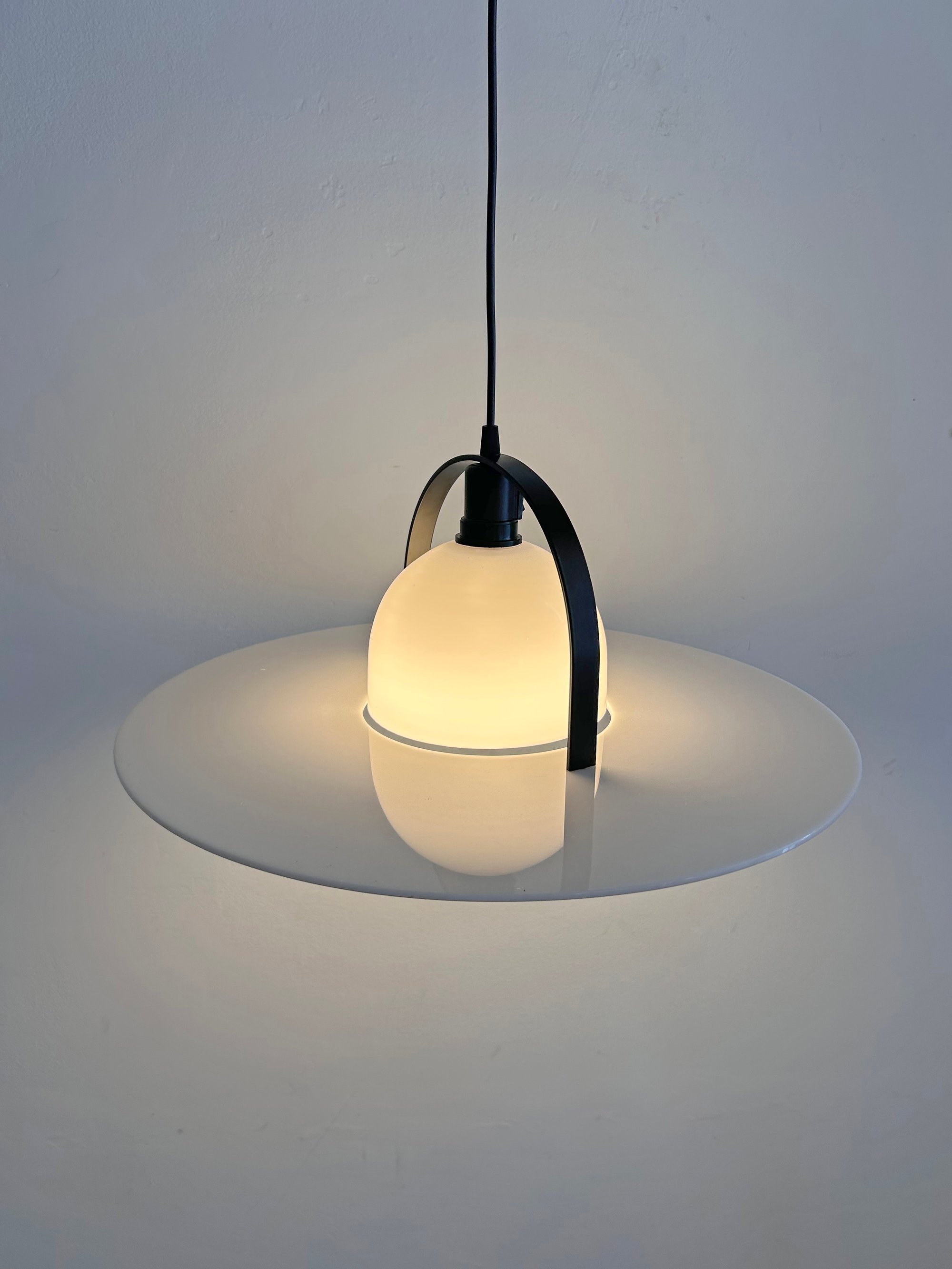 No me puede gustar más. Tiene estilazo máximo. Diseñada por Gabriel Teixidó para Carpyen a finales de los 70Super interesante mezcla de materiales: difusor blanco de vidrio, disco de metacrilato y “U” metálica negra. Instalación original. Portalámparas E27 con interruptor. La luz que proyecta es muy agradable. Medidas: 52 cm de diámetro x 16 cm de alto; altura máxima a techo 140 cm.