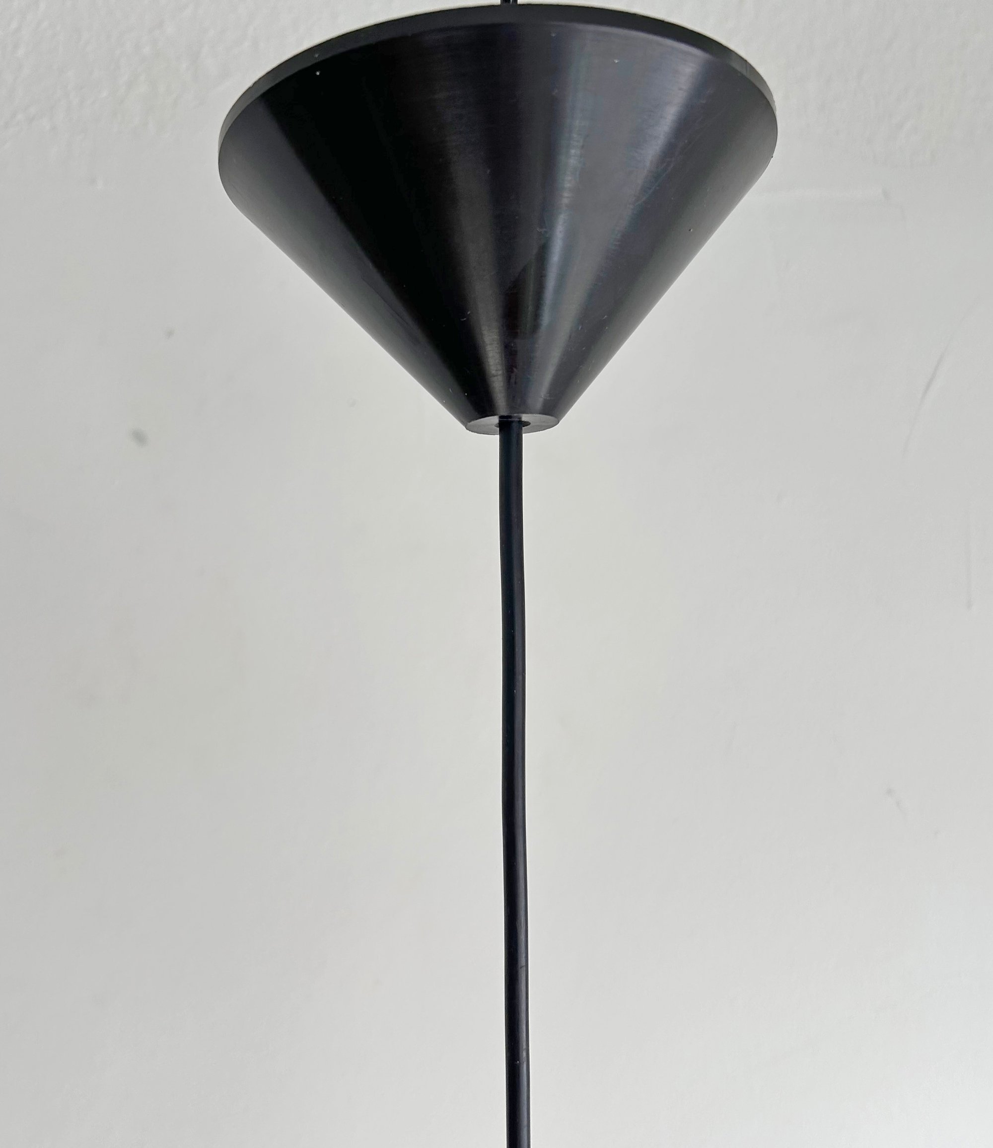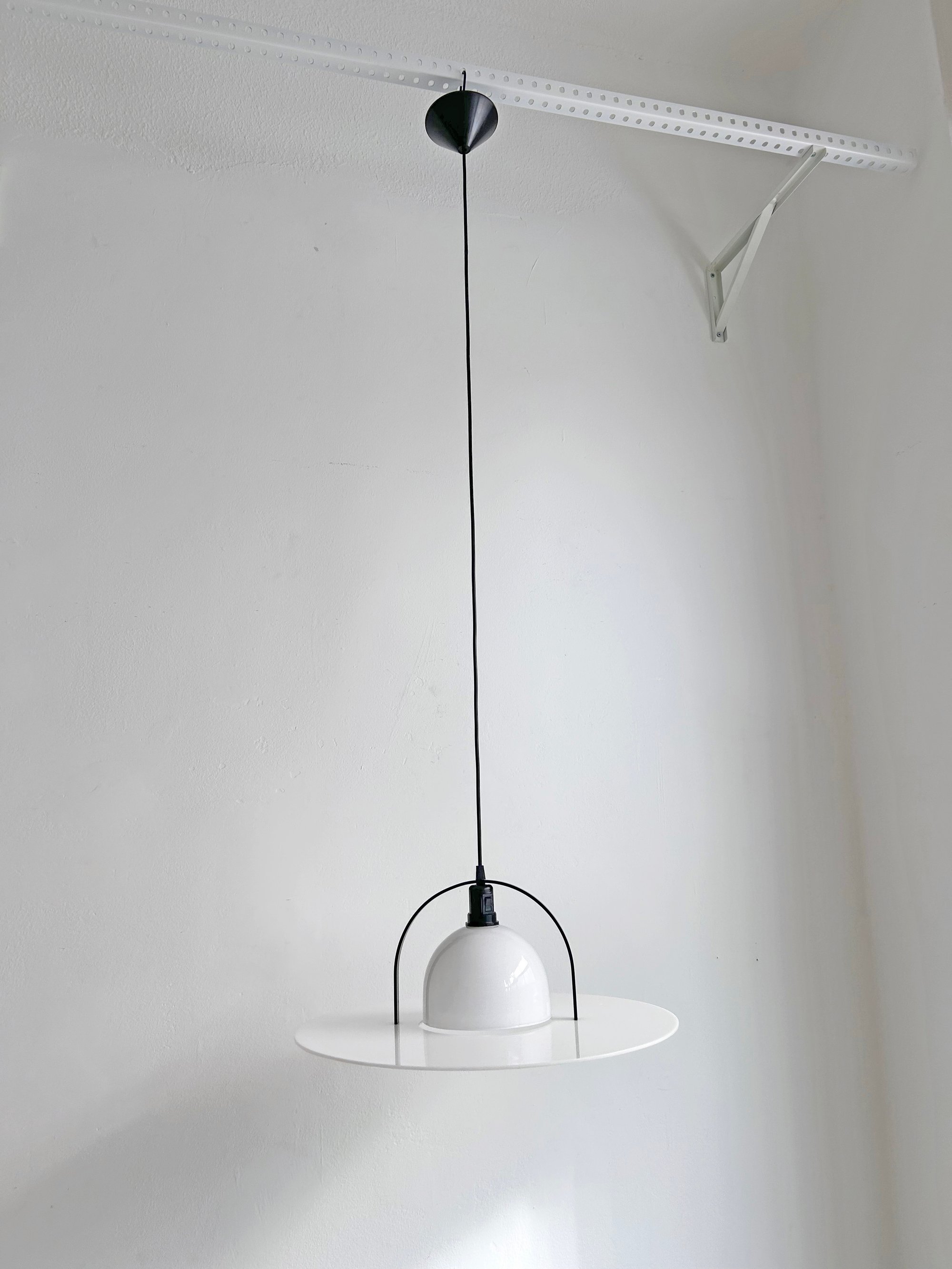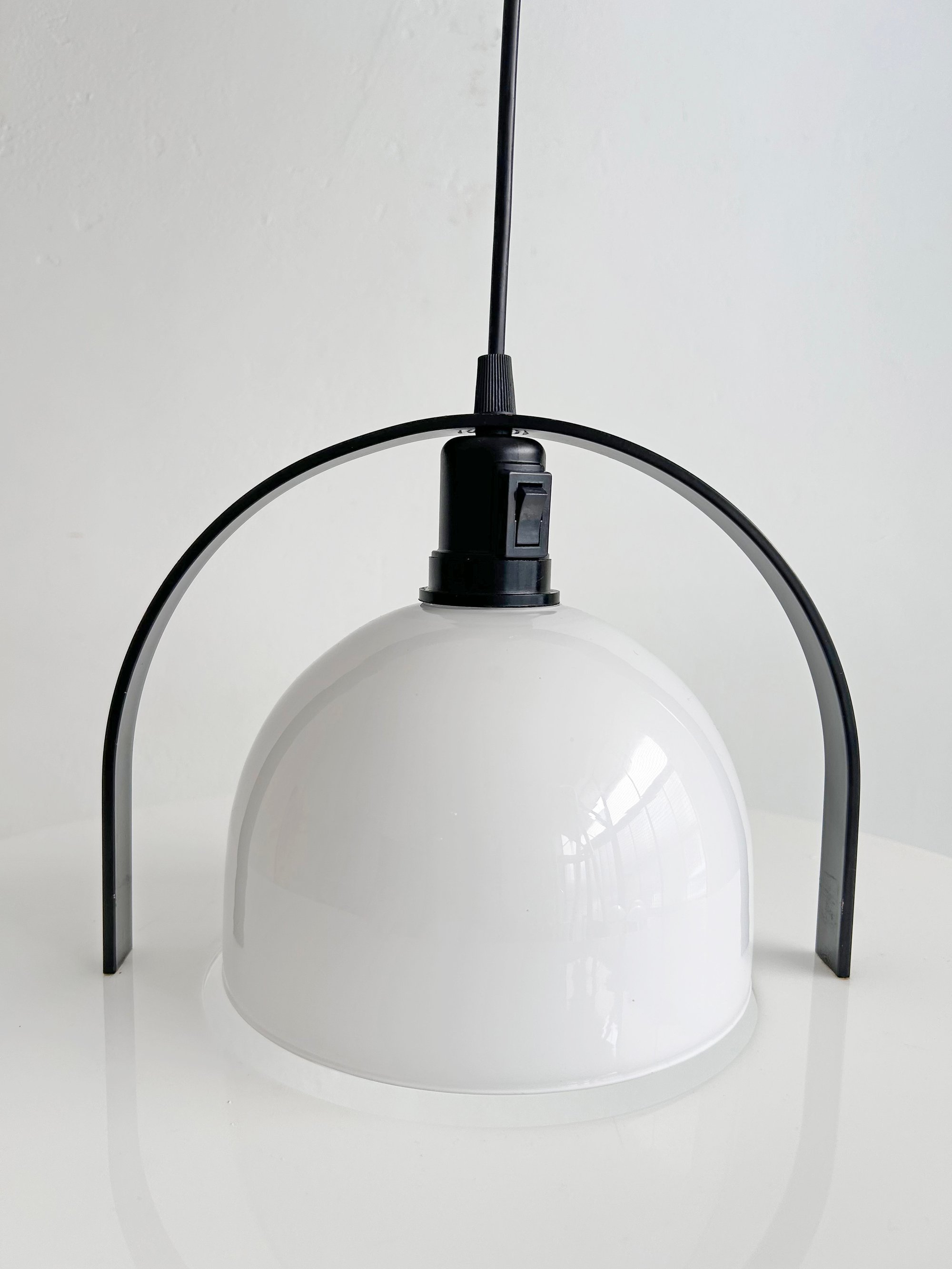 No me puede gustar más. Tiene estilazo máximo. Diseñada por Gabriel Teixidó para Carpyen a finales de los 70Super interesante mezcla de materiales: difusor blanco de vidrio, disco de metacrilato y “U” metálica negra. Instalación original. Portalámparas E27 con interruptor. La luz que proyecta es muy agradable. Medidas: 52 cm de diámetro x 16 cm de alto; altura máxima a techo 140 cm.