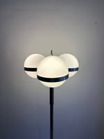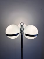 Cuerpo metálico cromado con tres aros horizontales, sujetando los globos blancos. Portalámparas E27. Instalación eléctrica original. Marcas del paso del tiempo en algunas zonas del cromado. Medidas: 145 cm de alto x 45 cm de diámetro, la base tiene 32 cm de diámetro.