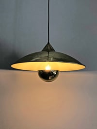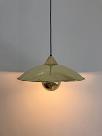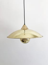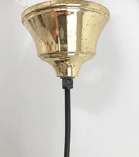 Lámpara de techo dorada con el interior lacado en blanco. Queda ideal con la bombilla grande con cúpula dorada, parece parte de la luminaria. Pocas marcas de uso. Cable textil nuevo. Portalámparas E27. Bombilla incluida. Altura máxima 130 cm. Diámetro de la pantalla 40 cm.