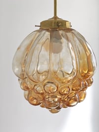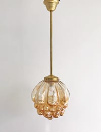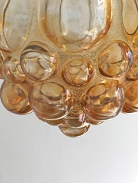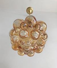 Preciosa lámpara que recuerda inevitablemente a la serie Bubble de la diseñadora finlandesa, Helena Tynell. Globo “burbuja” en color caramelo dorado con efecto irisado. Estructura y cableado nuevo, portalámparas E27. Solo pudimos rescatar el globo, todo lo demás estaba en pésimo estado. Buscamos piezas similares a las originales para mantener la misma estética. Medidas: 72 cm de alto x 26 cm de diámetro x 26 cm de altura del globo.