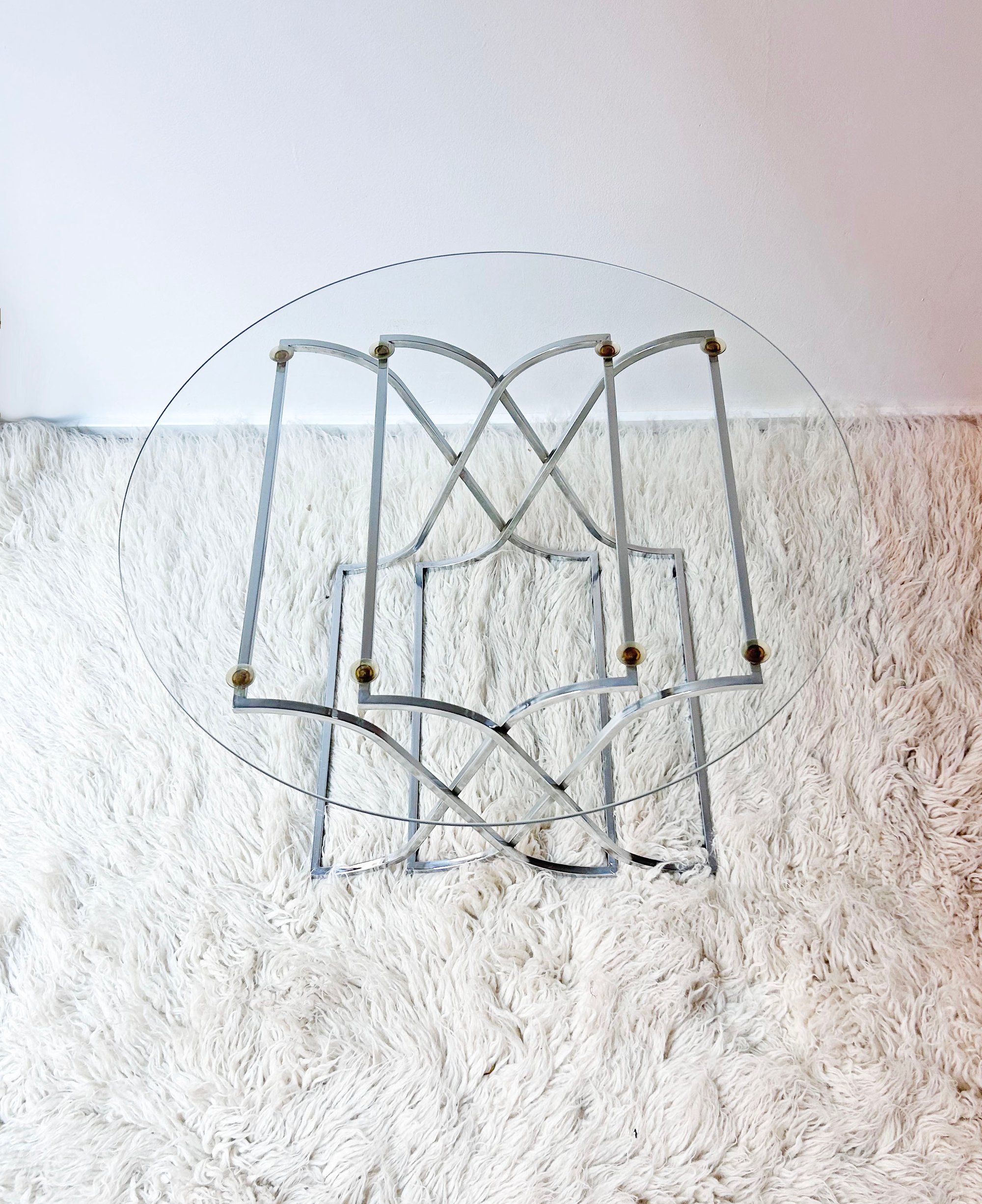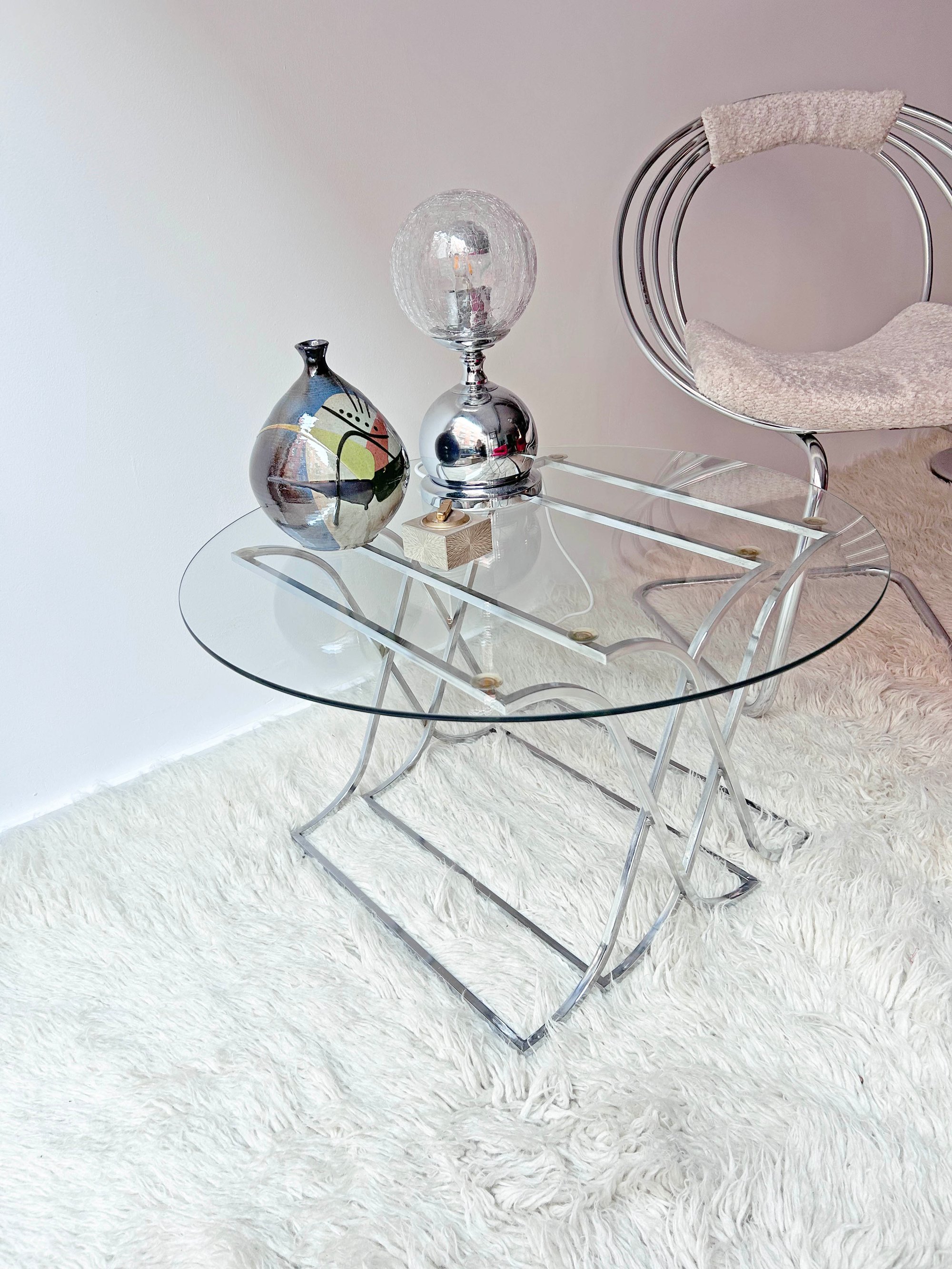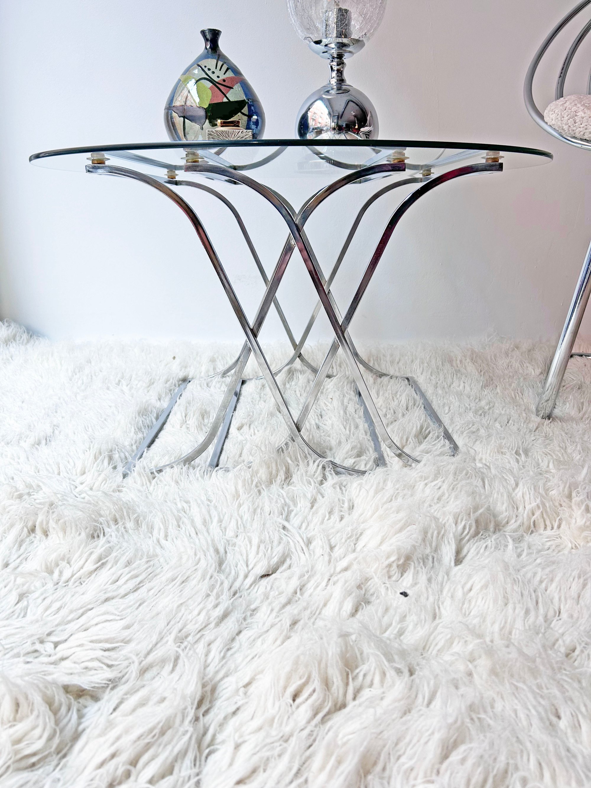 Curiosa mesita auxiliar con sobre de vidrio y estructura cromada cruzada, creando un bonito dibujo. El sobre se sujeta mediante ventosas. Pocas marcas de uso. Ideal para usar en zona de salón, ya sea entre sofás o como mesa de centro. Perfecta para espacios pequeños. Procedencia vaciado de piso extrarradio de Madrid. Medidas: