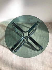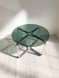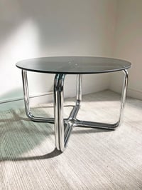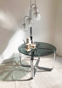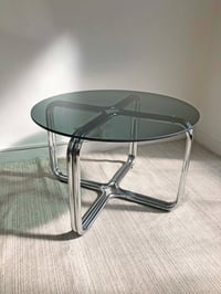 Cuerpo cromado en forma de equis que sujeta el sobre con unas ventosas. Ligeras marcas de uso en el vidrio y en el cromado de las patas. Ventosas nuevas. Se ha pulido el acero retirando pequeñas marquitas de óxido. Medidas: 48 cm de alto x 75 cm de diámetro.