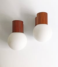 Retiramos todo el barniz para dejar la madera cruda, y aplicar un reparador. Cableado nuevo. Globos blancos mates opalinos. Medidas: 24 cm de alto x 17 cm de fondo x 17 cm de ancho. Se pueden colocar el globo hacia arriba o hacia abajo. Ideales para un baño, pasillo, dormitorio…