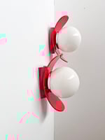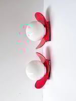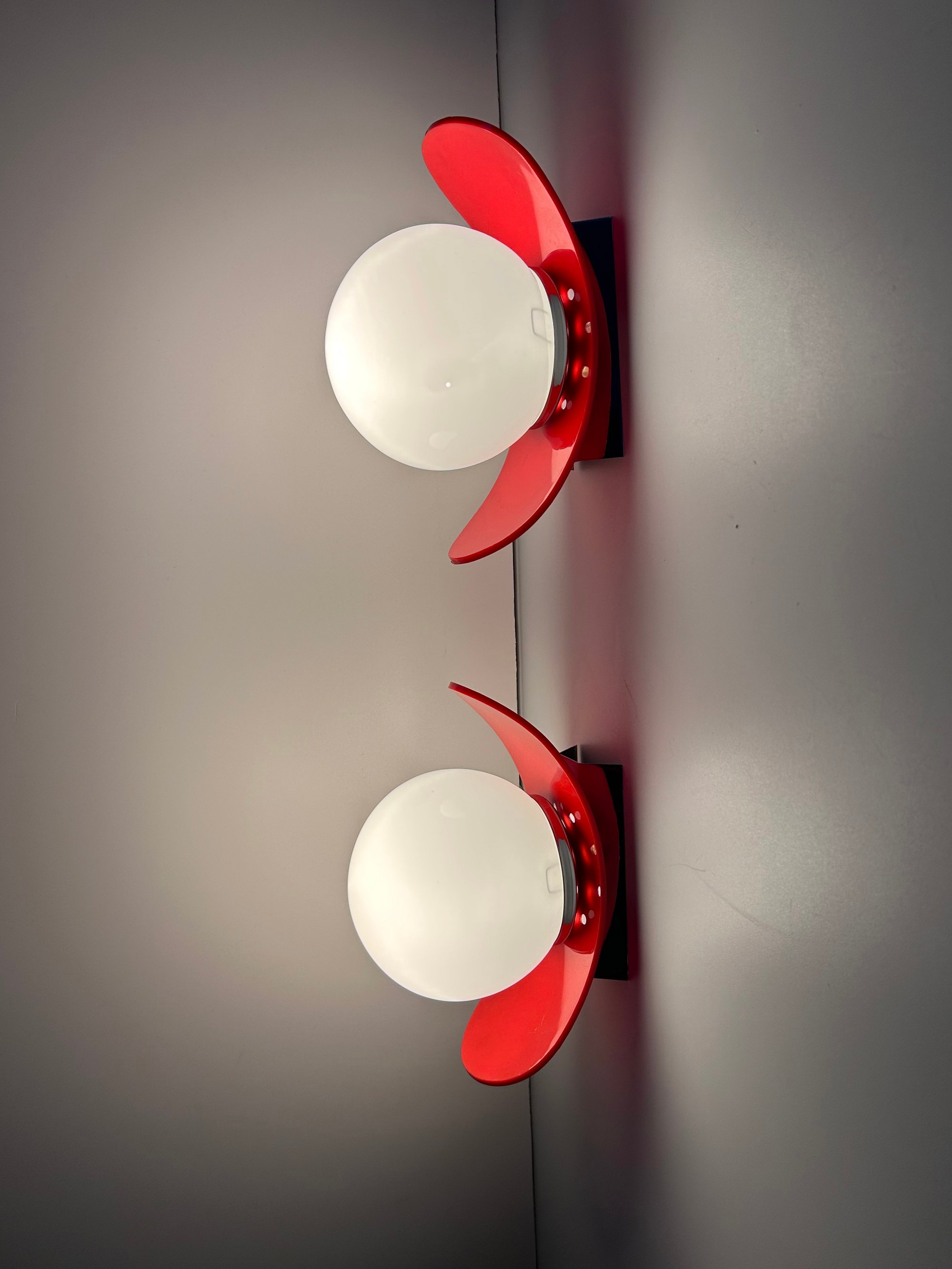 Preciosos apliques con pestaña en color rojo y globo opalino en blanco. Instalación eléctrica nueva. Casquillo E14. Se sujeta con una pieza cromada a la pared. Medidas: 22 cm de alto x 13 cm de ancho x 15 cm de fondo.