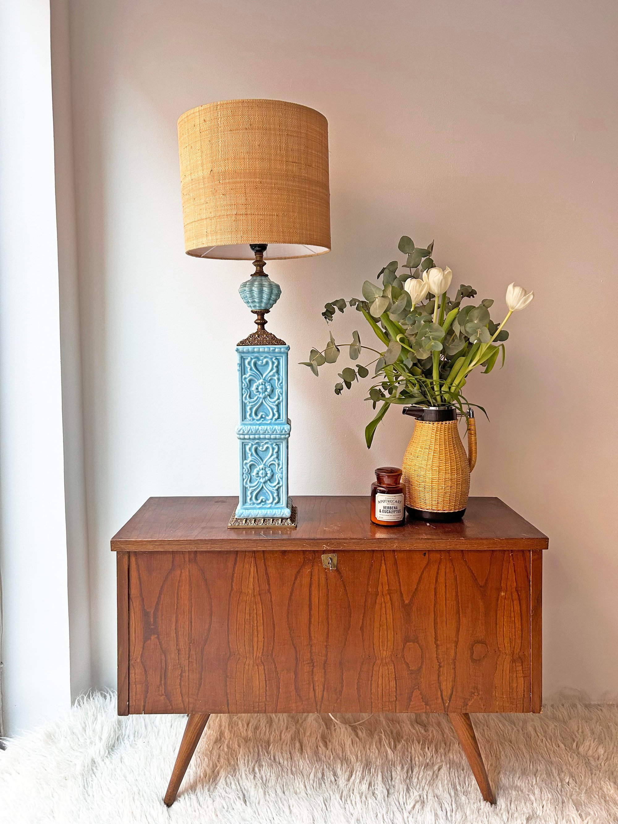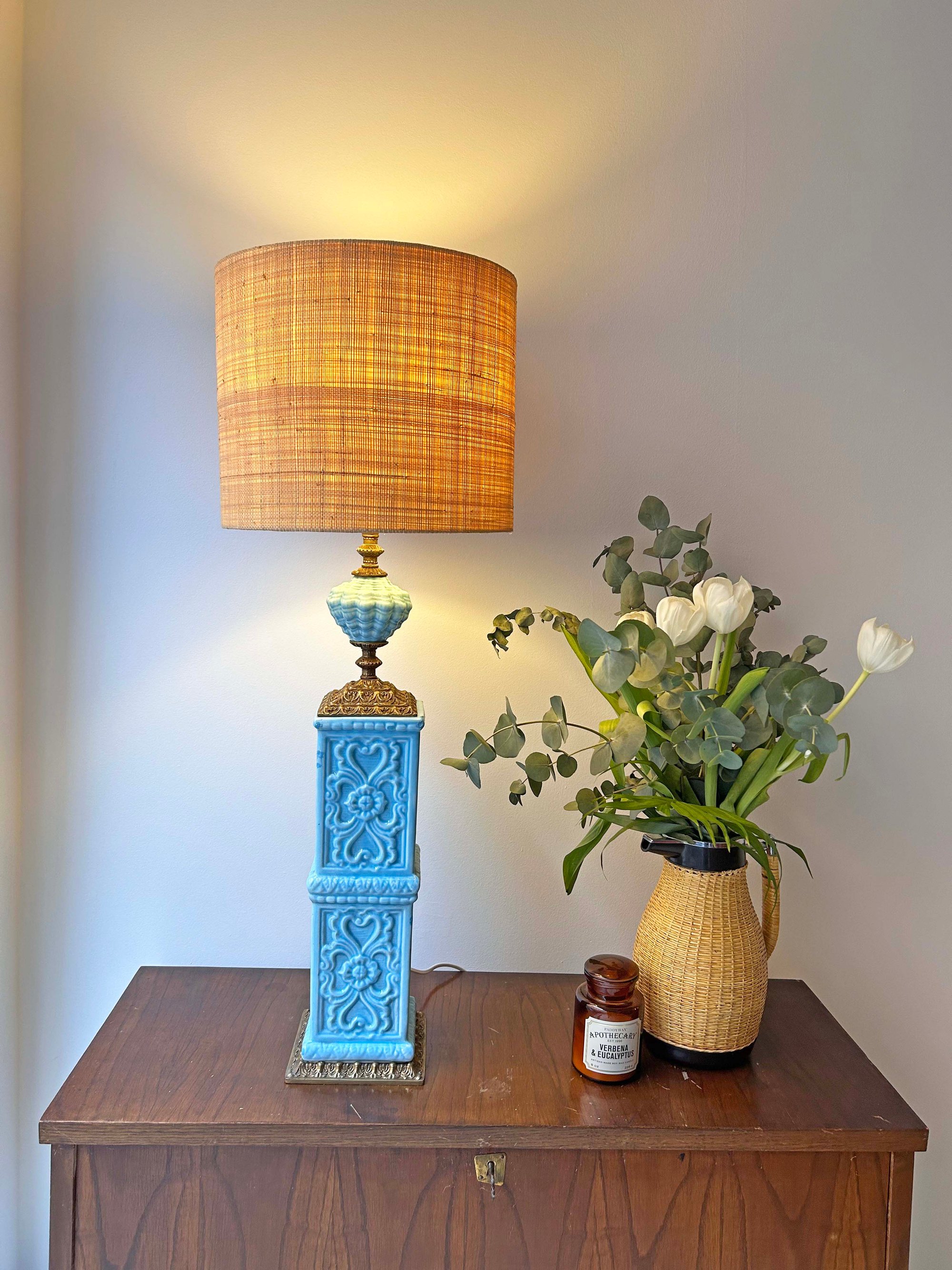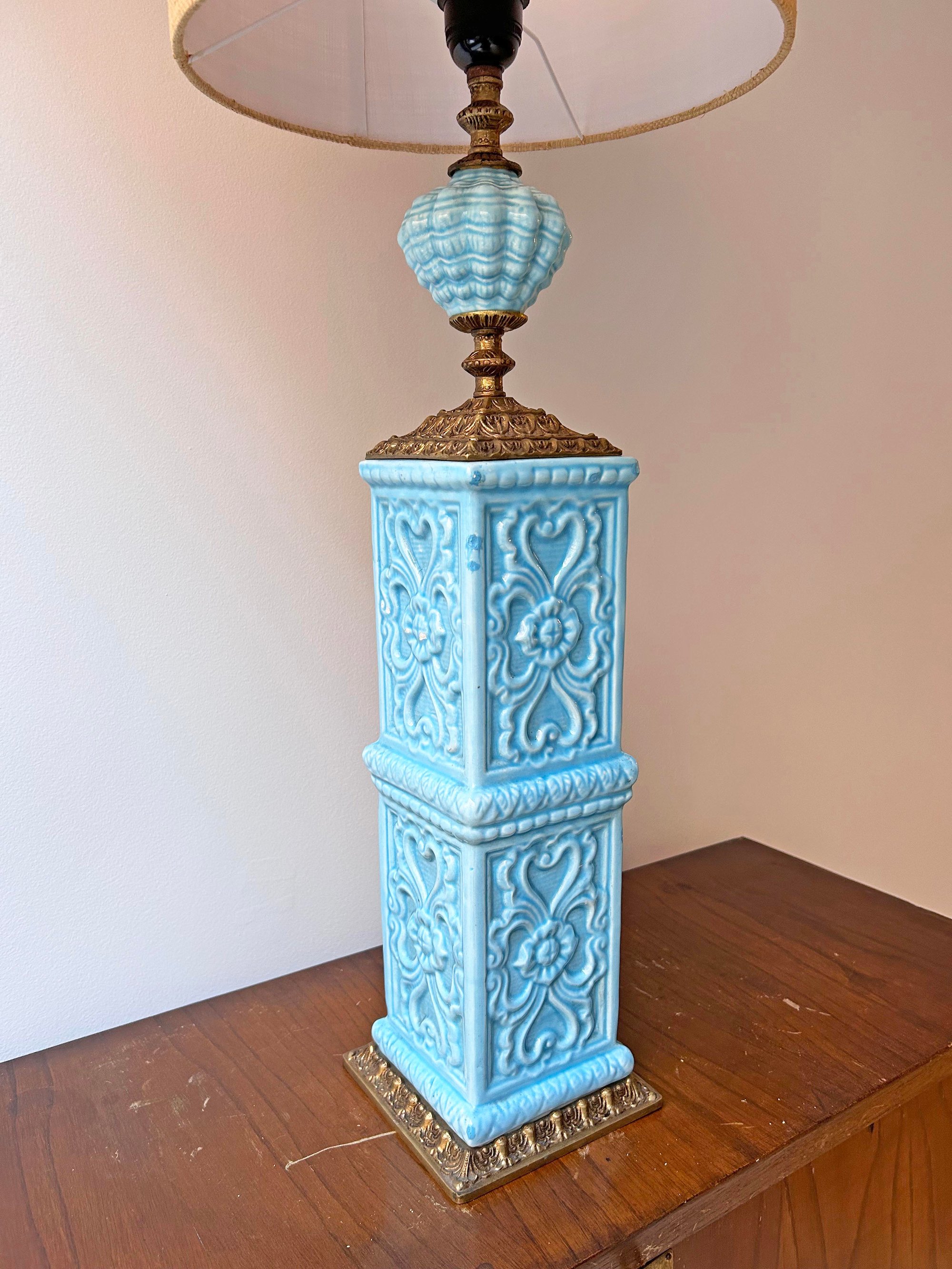 Lámpara cerámica en color azul, con relieves en las cuatro caras, y detalles en bronce. Procede de almacén de lámparas cerrado desde hace 30 años. Portalámparas E27. Curiosamente tiene faltas que han cubierto con pintura al tono. Medidas: 63 cm de alto x 14,5 cm de ancho x 14,5 cm de fondo. La pantalla no se vende.