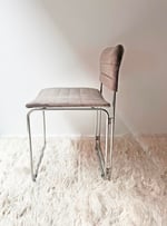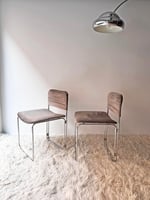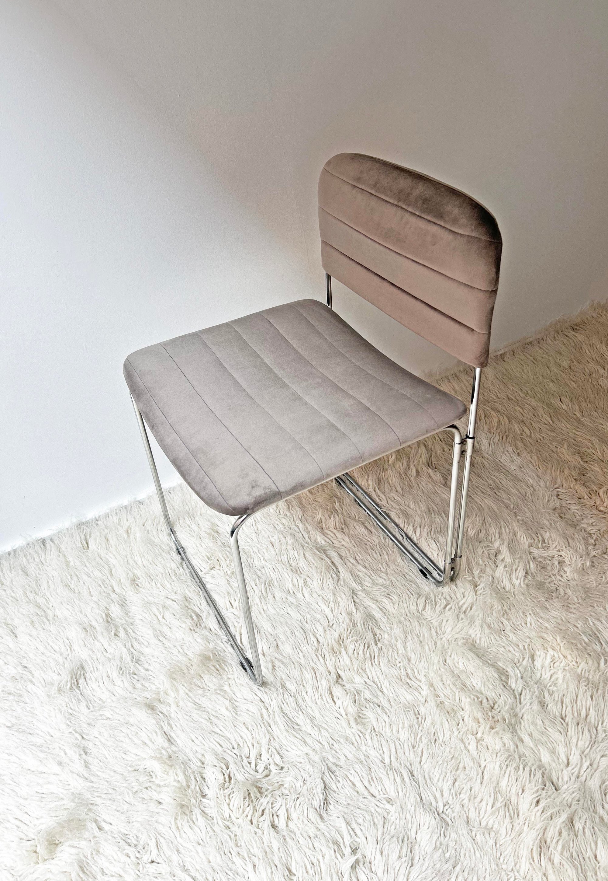 La empresa catalana, Grassoler produjo el modelo FANO, desde el año 1972 hasta 1988. Esteve Agulló diseñó una serie de piezas, con varilla curvada y costuras horizontales. Tapicería de tercipelo gris humo en muy buen estado, probablemente no es la original. Se han pulido las varillas recuperando brillo. Se vende el set completo. Procedencia: sala de juntas de despacho en Chamberí. Medidas: 76 cm de alto x 51 cm de ancho x 54 cm de fondo.