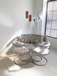 Mesa de diseño singular con estructura en cromado y sobre ahumado en tono marrón cálido. Las sillas encajan y “abrazan” la mesa. Están retapizadas en un tejido tipo boucle fino. Se vende el set completo. Todo en un estado estupendo. Medidas: diámetro de la mesa 108,5 cm x 72 cm de altura; sillas: 71 cm de alto x 52 cm de ancho x 46 cm de fondo; altura asiento 44 cm.