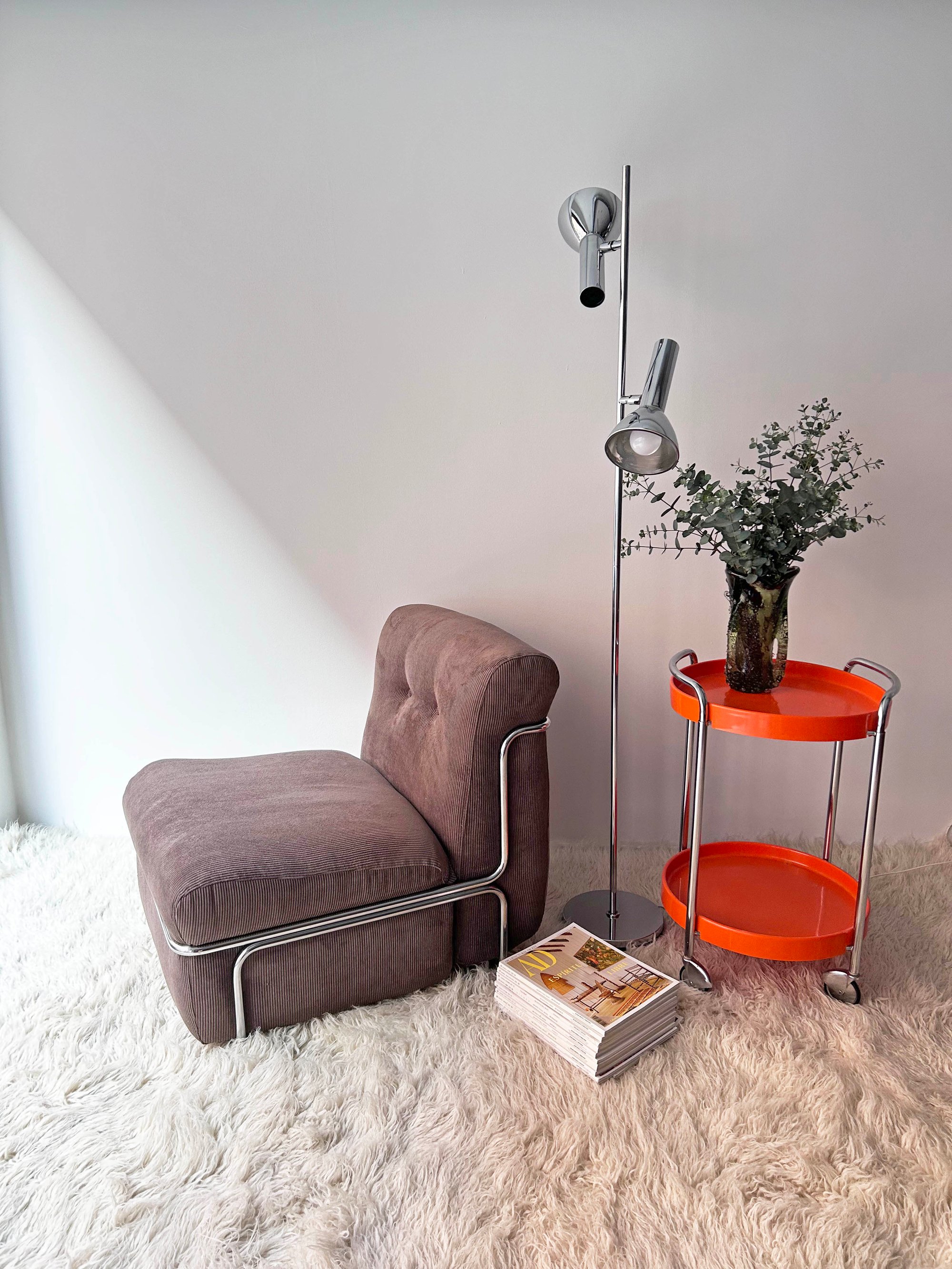 SILLÓN VINTAGE CROMADO CON PANA MARRÓN, AÑOS 70