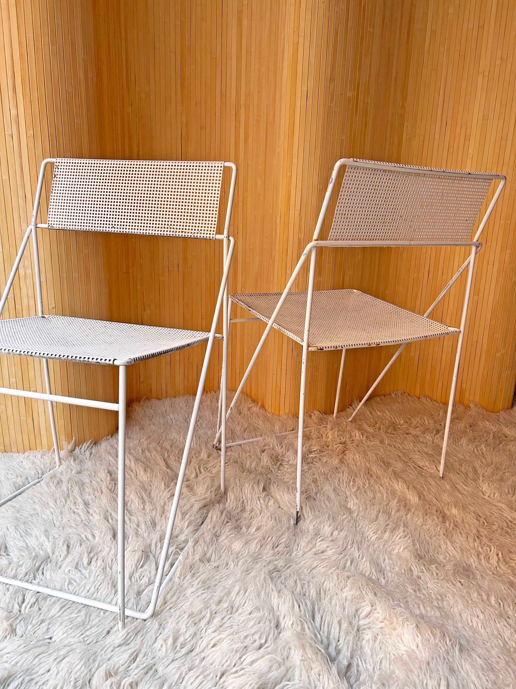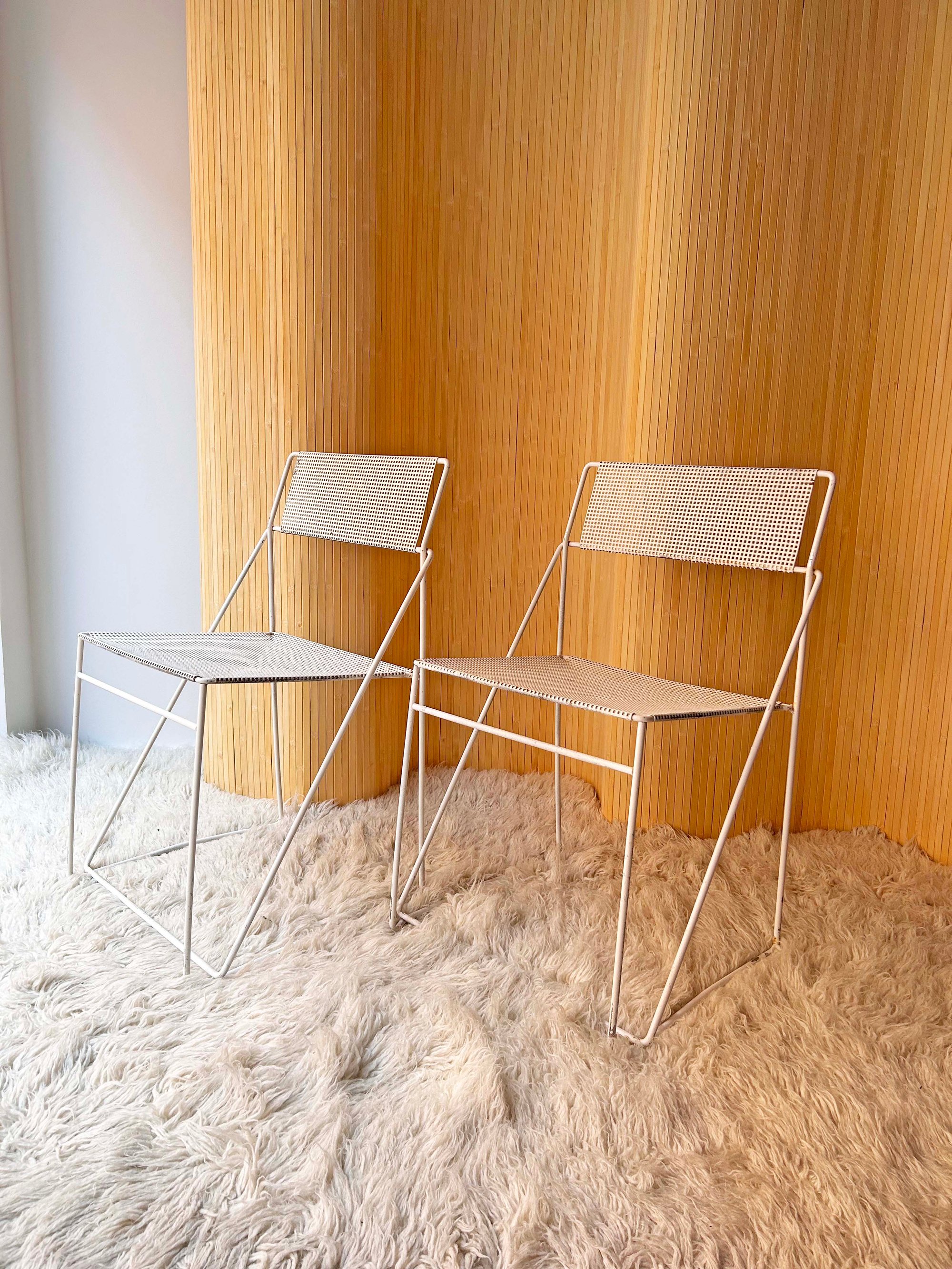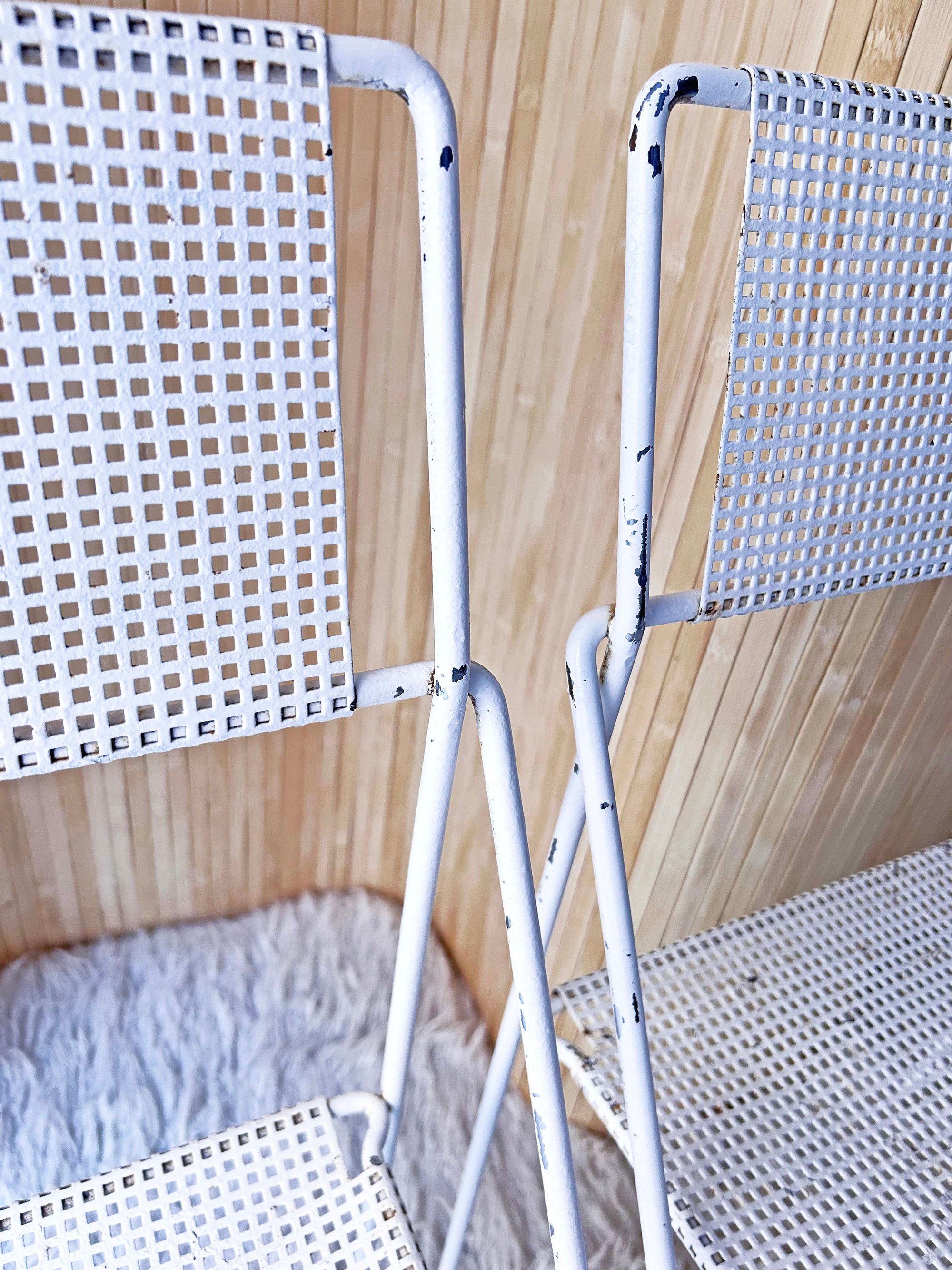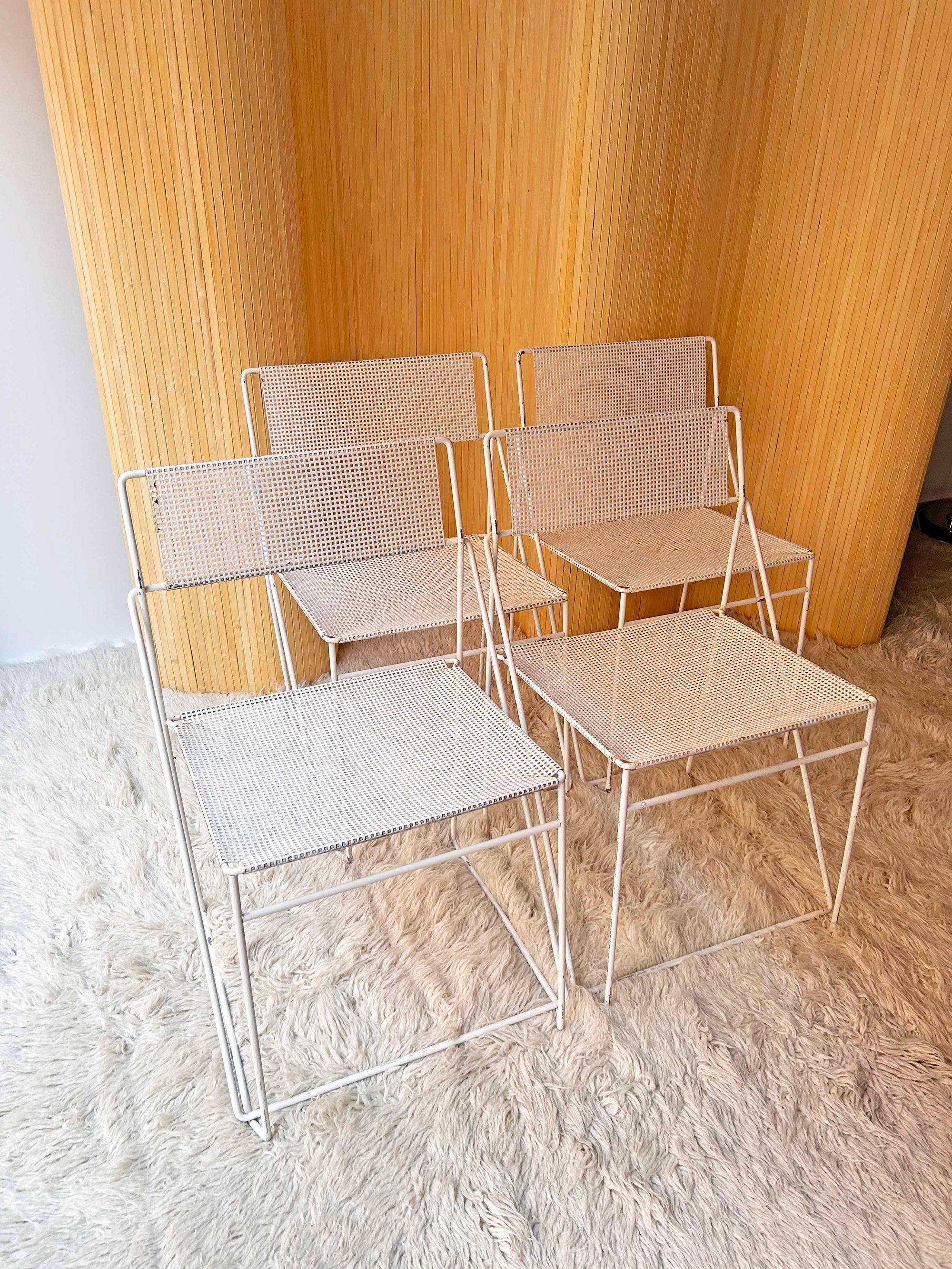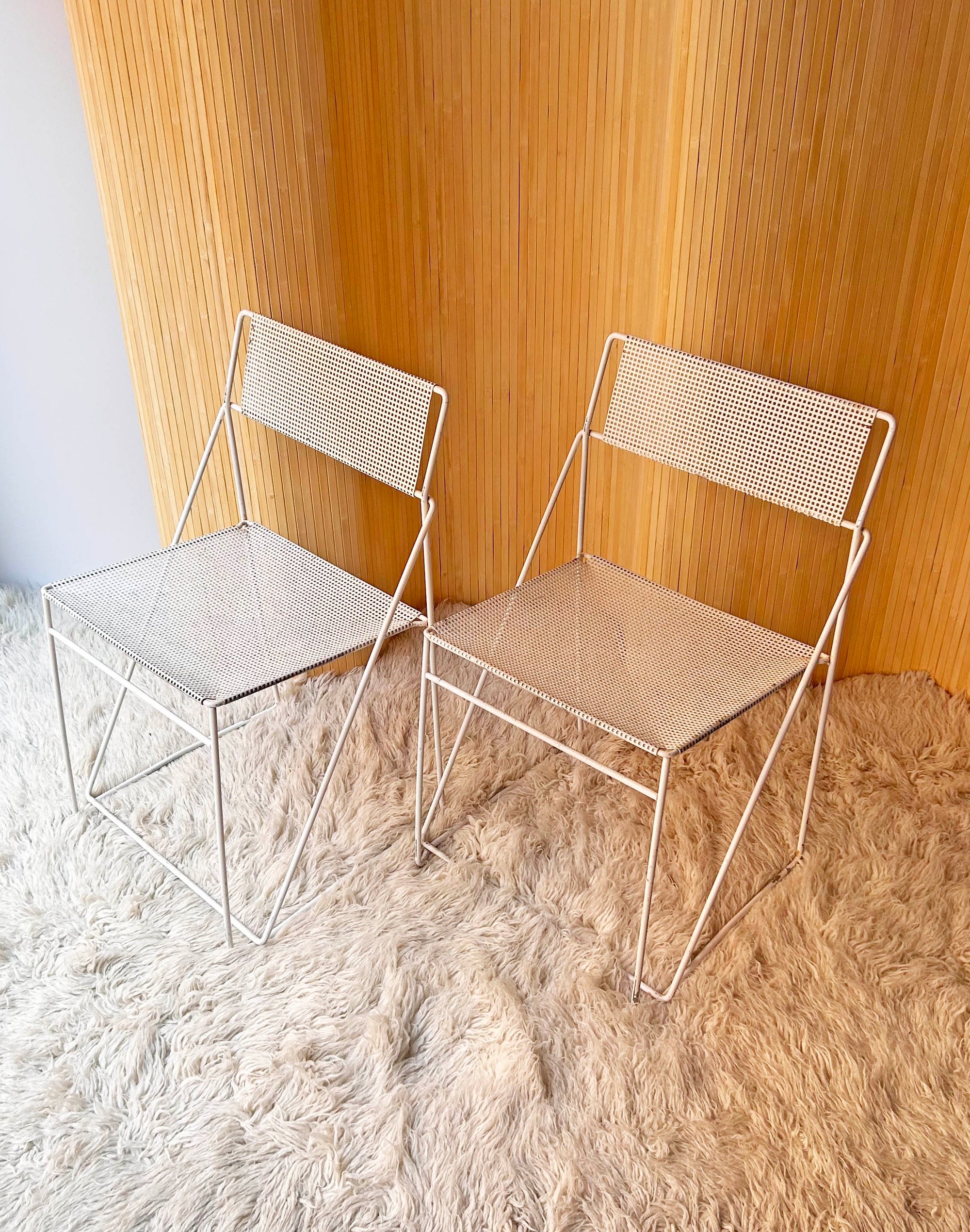 Diseñadas por Niels Jørgen Haugesen en la década de los años 70. Este set ha sufrido lo suyo a la intemperie durante muchos años. Llegaron cubiertas de óxido y suciedad. Después de unas cuantas horas conseguí que recuperaran su encanto conservando su pátina. Tiene muchas faltas de pintura, que particularmente me encantan. Medidas: 77 cm de alto x 51 cm de ancho x 46 cm de fondo. Altura del asiento, 45 cm.